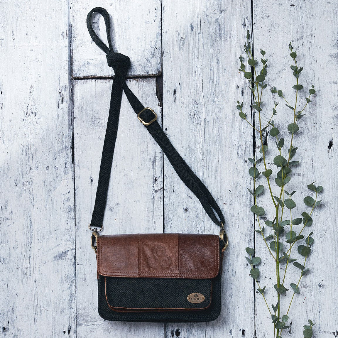 Black and dark green herringbone tweed and leather mini bag, concertina style with flap and adjustable herringbone tweed shoulder strap. With AWM embossed logo on the centre of the leather patchwork flap and a branded antique brass finished oval metal disc at the side front. A metal zip fastens the bag, which houses various compartments, including a back zipped pocket, front open pocket under the main flap, a zipped closure on the main interior compartment, which has generous organised space within. It also has a card holder. With so many pockets and compartments this versatile bag is sure to be your go to handy small bag that can be worn on the shoulder or across the body. The hardware has an antique brass finish. Crafted in 100% woollen tweed and brown leather, with brown polyester fabric lining, this flap bag is part of a herringbone tweed and leather handbag collection. Designed in Ireland. Dimensions: Height 14cm (5.5" approx.) Depth of base 6cm (2.5" approx.) Width 21cm (8" approx.)