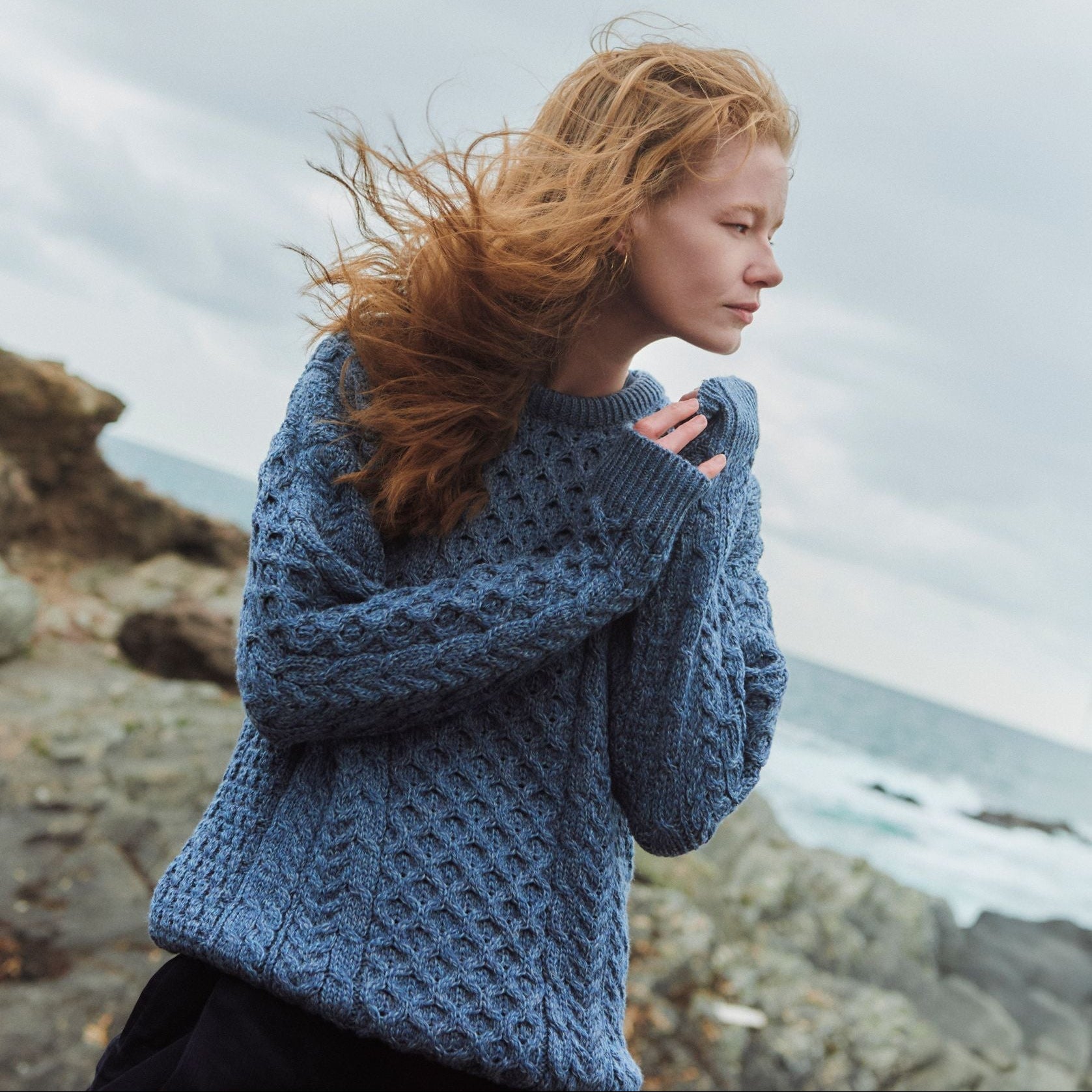 The Inisheer sweater showcases a classic Aran design, featuring intricate cable and honeycomb stitches that not only add visual appeal but also carry rich historical significance, symbolizing the rugged landscapes and seafaring legacy of the Aran Islands. The deep color provides a modern twist, making it a versatile addition to any wardrobe, perfect for both casual and sophisticated ensembles.