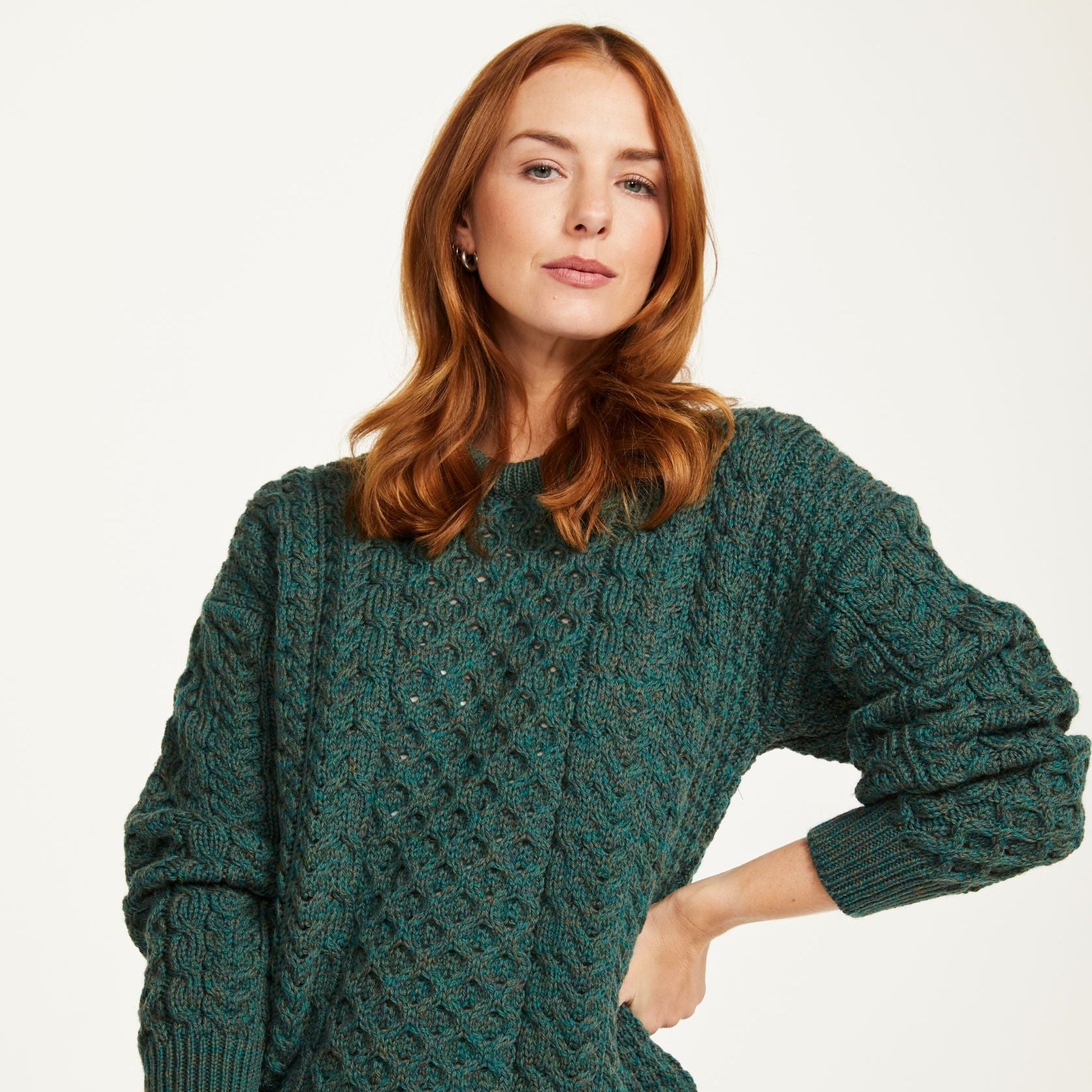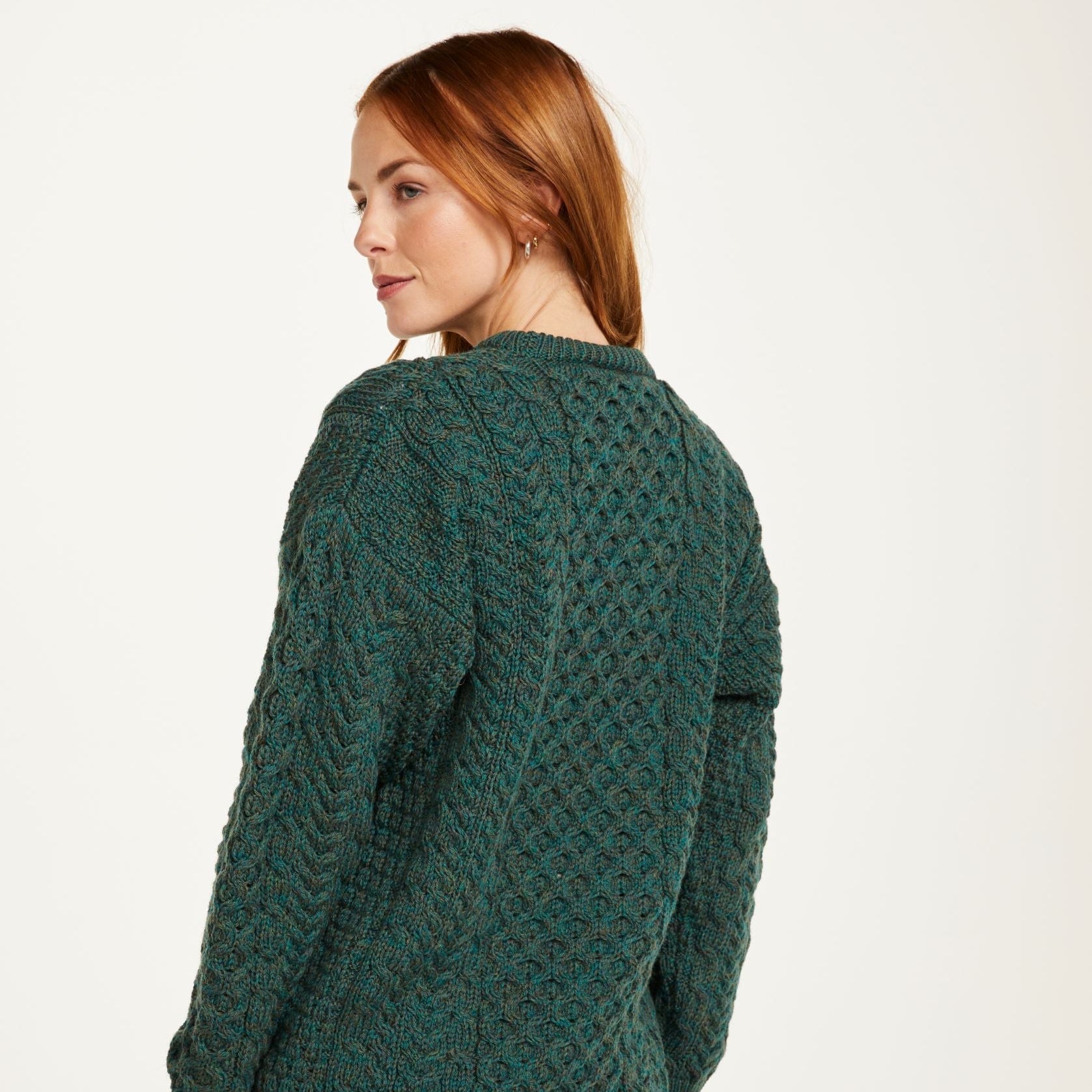 Whether you're strolling through a bustling city or enjoying a serene countryside retreat, the Inisheer Traditional Ladies Aran Sweater offers both style and substance, making it a must-have piece for any discerning wardrobe. Experience the luxury of Irish craftsmanship and keep warm in style.