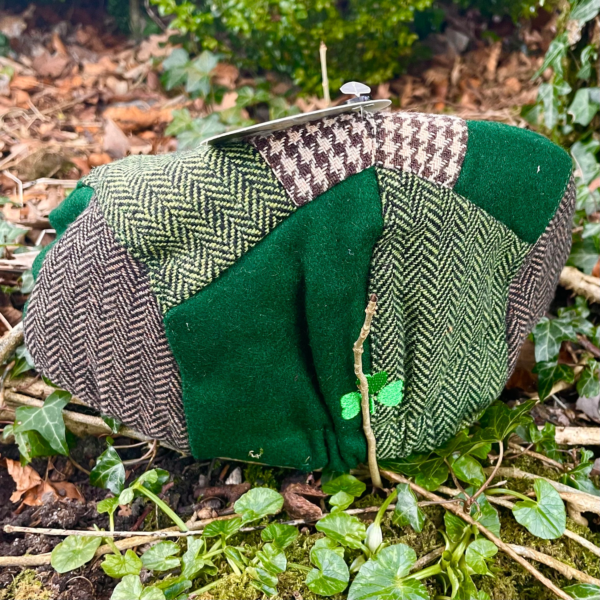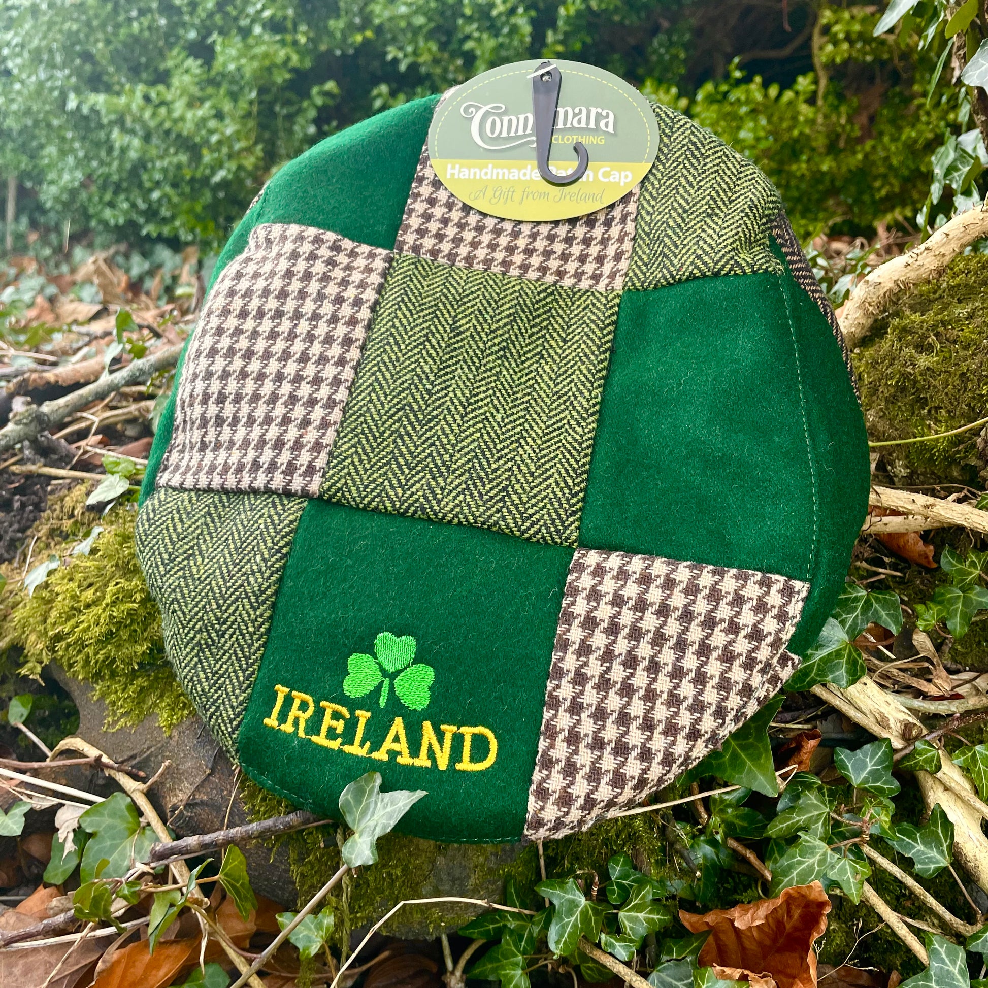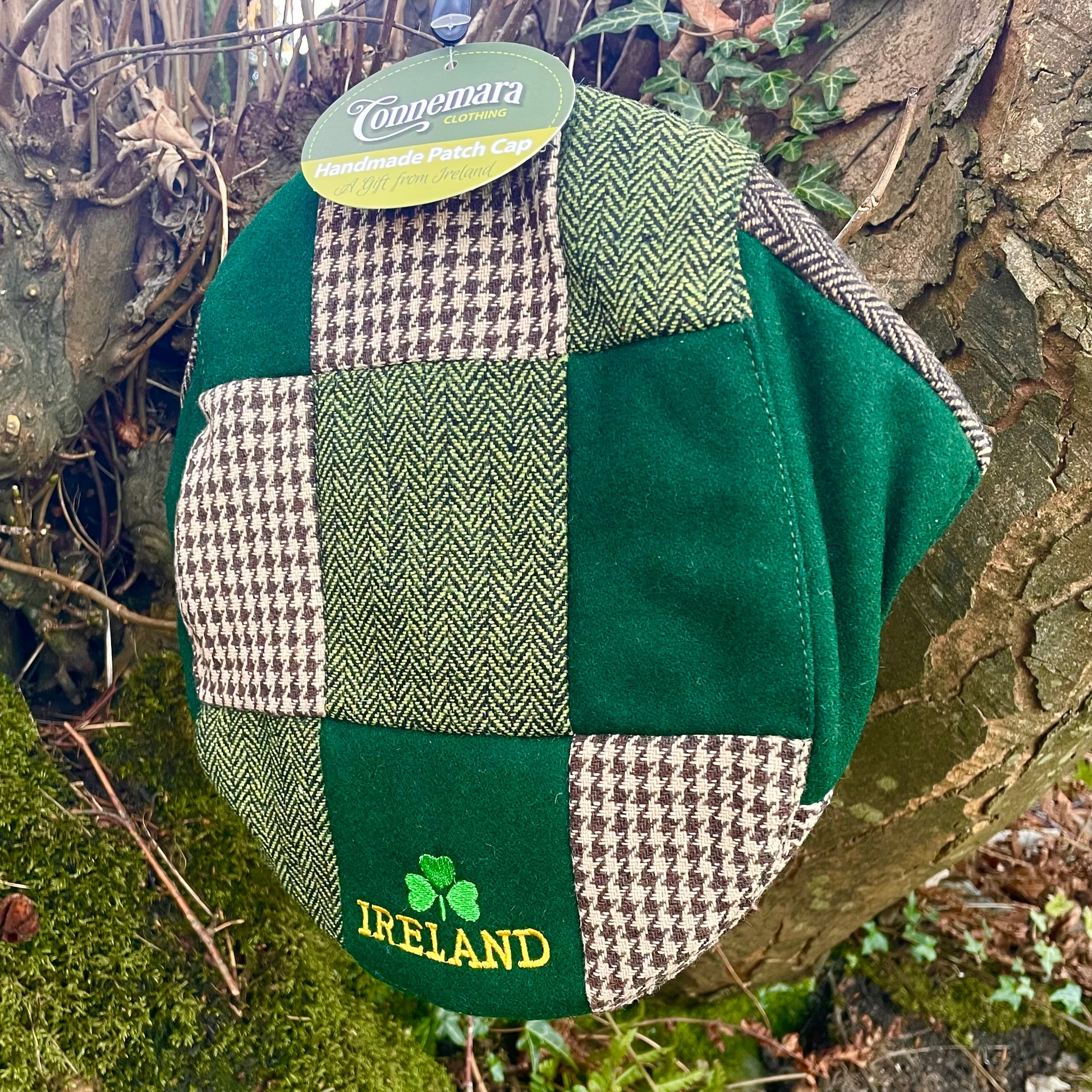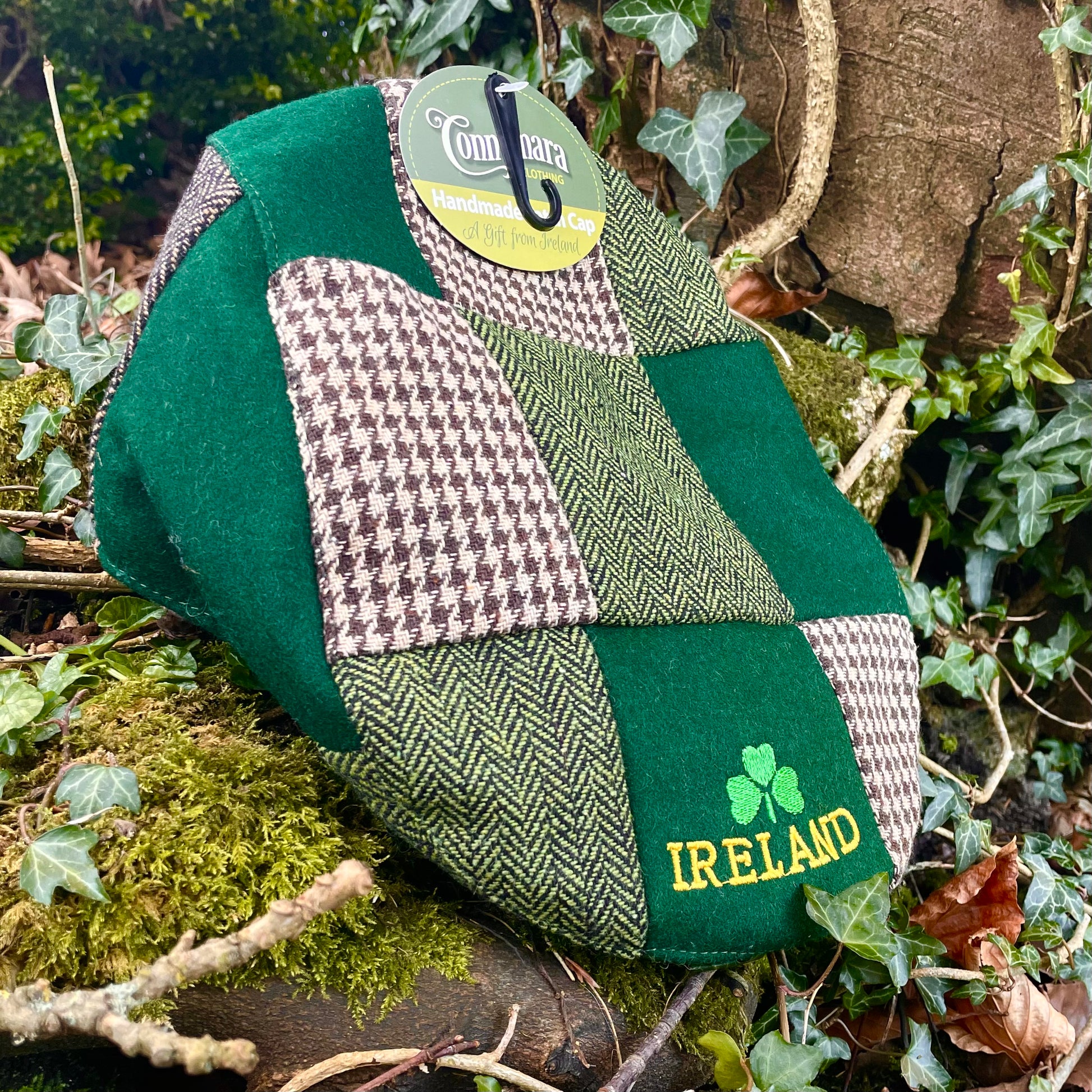This unique cap features multiple patches in varying shades of green and brown, creating a distinct and eye-catching look. The elasticated band ensures a one-size-fits-most style, providing a comfortable fit. Discover the Irish blessing stitched inside, adding an extra touch of charm.