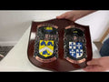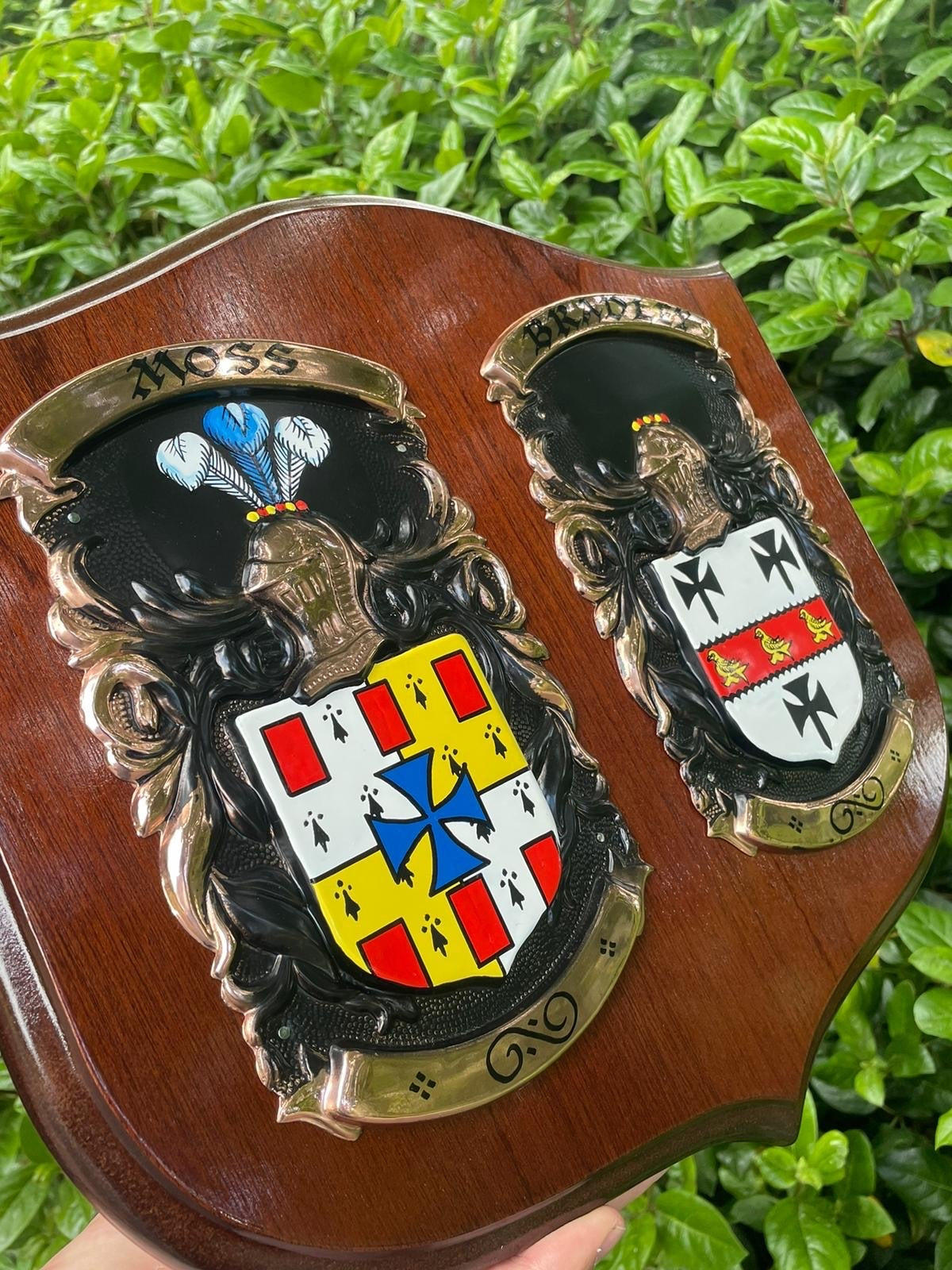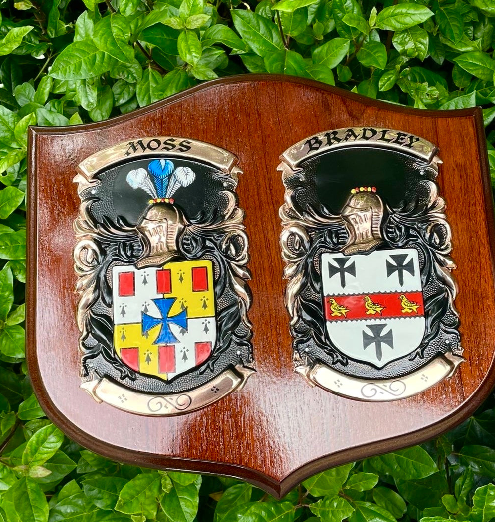 This is our largest double shield and it really does make a statement at 18 inches wide! Ideal for wedding gift, new home or anniversary gift. Two family crests side by side. A perfect gift for an anniversary or wedding. The Wedding Day Shield features two Irish Coat of Arms beautifully hand painted onto copper and mounted onto either a mahogany or oak wooden base. Crafted in Dublin by a dedicated team of heraldic artists, these skilled experts have been applying their craft and hand painting Coats of Arms in Dublin for over 60 years.