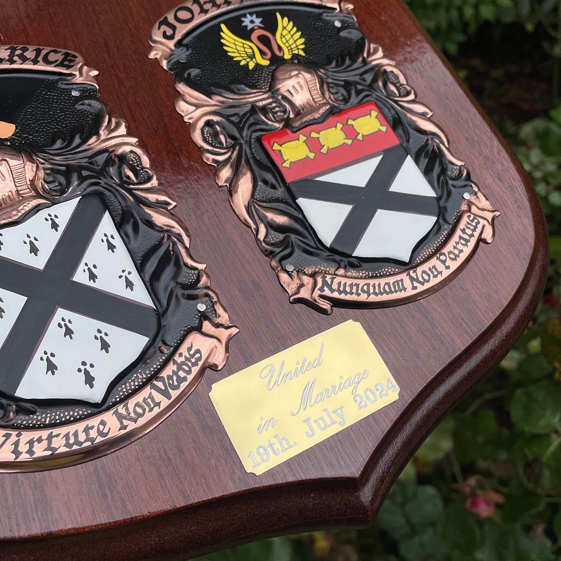 - 'United in Marriage' Plate: Add a plate dedicated to the couple. (Select 'Shield + 'United in Marriage' Plate' and write the date in the order notes. A wonderful way to commemorate the date in writing.