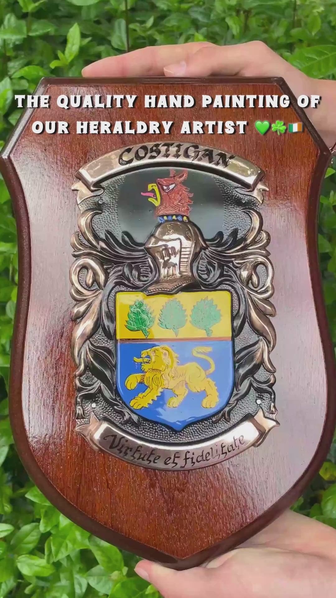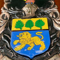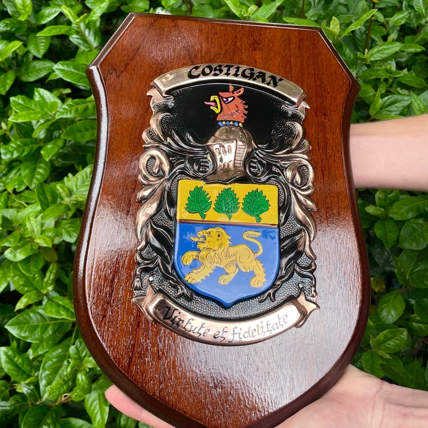 The large single family crest shield features your Coat of Arms beautifully hand painted onto copper and mounted onto either a mahogany or oak wooden base. This beautifully crafted dedication to last names is the work of a dedicated team of heraldic artists, who have been applying their craft and hand painting Coats of Arms in Dublin, Ireland for over 60 years.