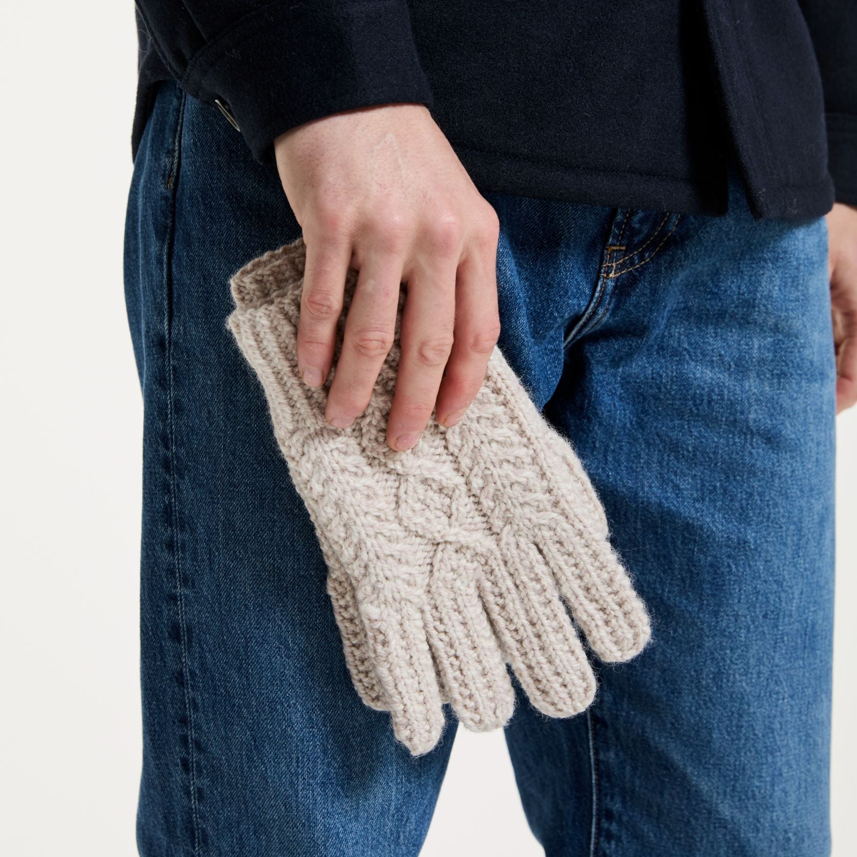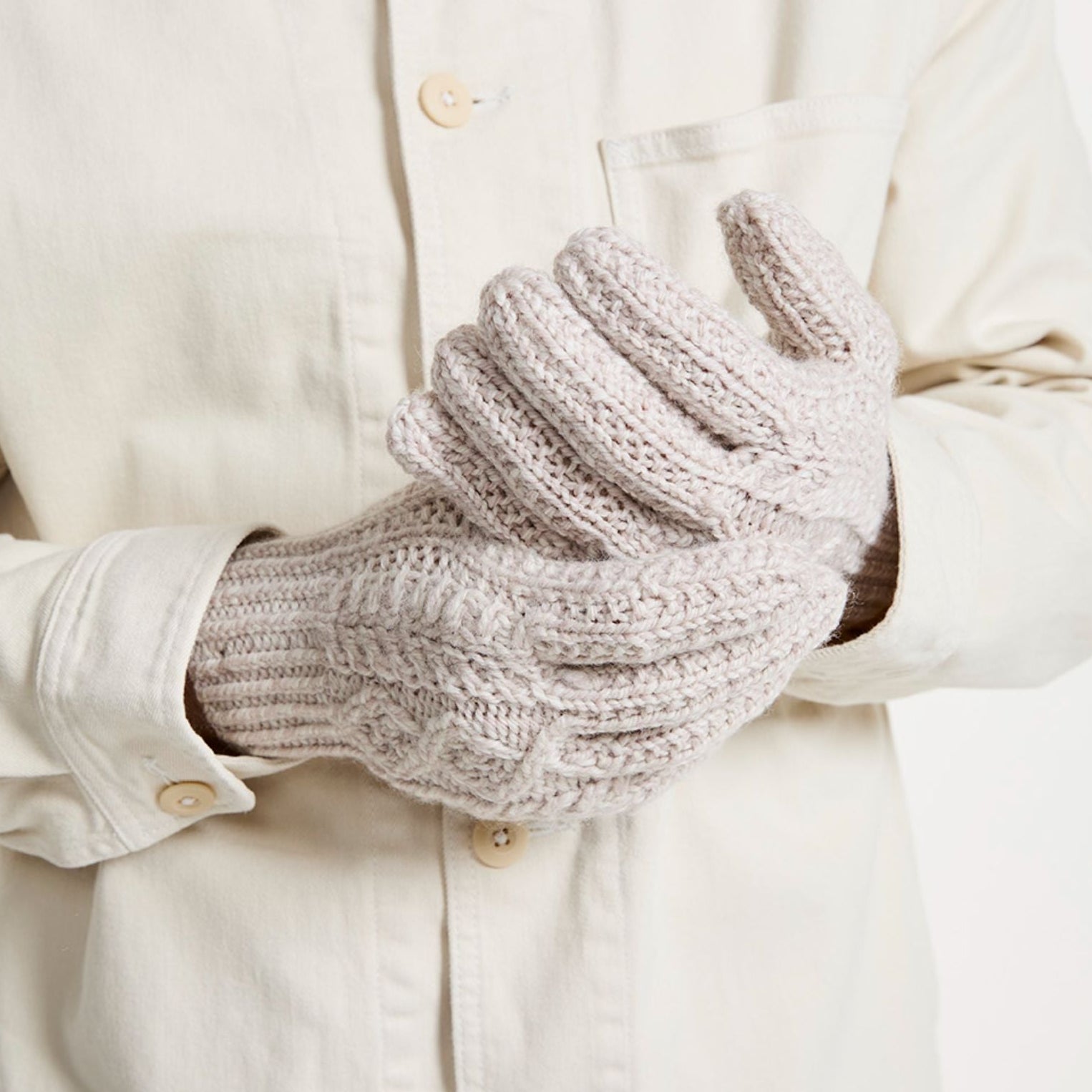 These luxurious gloves feature the traditional Aran diamond stitch filled with moss stitch, framed by elegant corded cables on the back of the hand.
