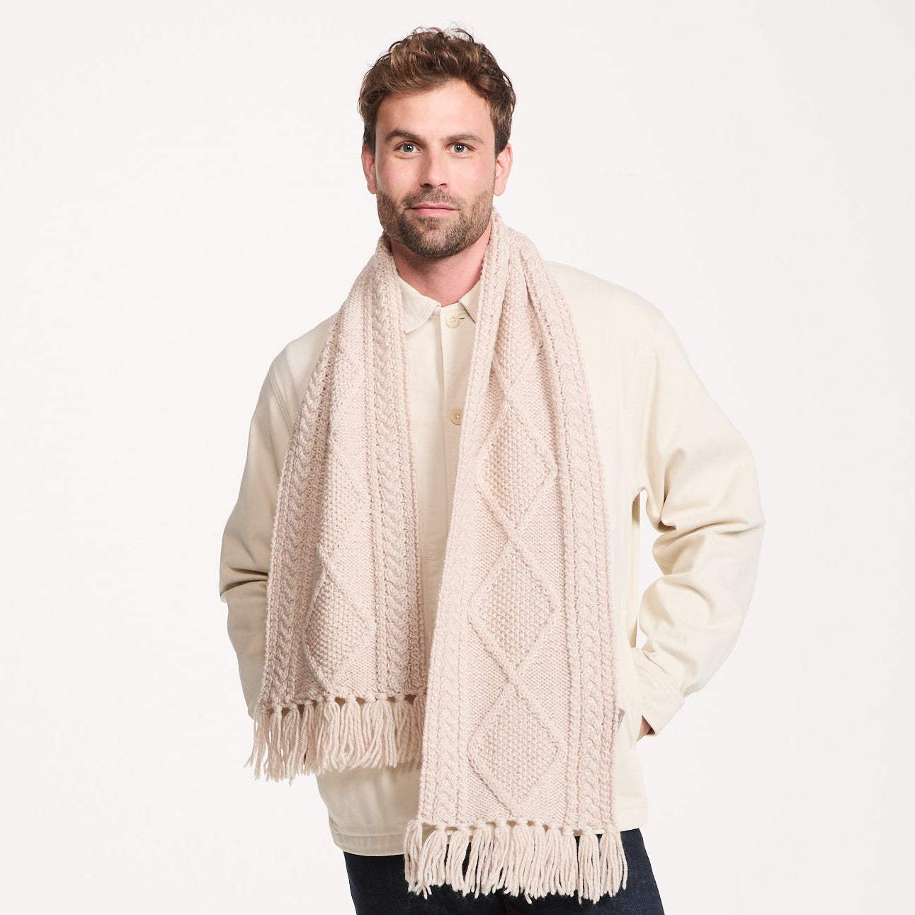 - Classic Aran Design: Inspired by the iconic Aran knit patterns, this scarf features intricate cable, honeycomb, and diamond stitching, symbolizing luck, strength, and the interconnectedness of life.