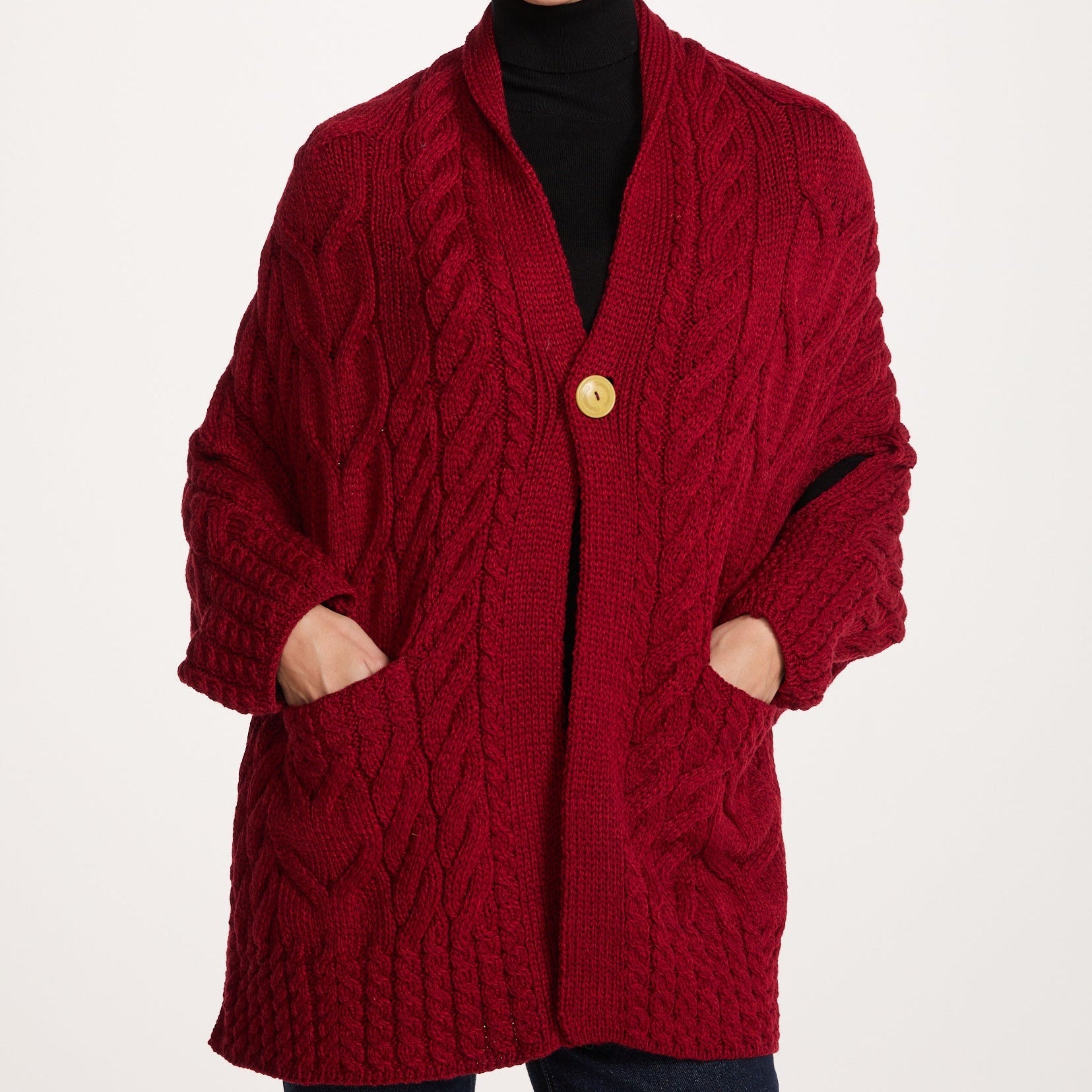 The Knocknarea Ladies Wrap Merino Red Cardigan is designed for comfort with presence. Made from 100% Merino wool, it feels soft against the skin while offering the natural warmth and breathability that quality Irish knitwear is known for. The flowing wrap shape creates an easy, relaxed fit that drapes beautifully, while the textured Aran stitching adds depth and heritage character. The bold red shade brings energy and confidence to the piece, making it just as suited to everyday wear as it is to special occasions. It’s a cardigan that feels traditional at heart but fits effortlessly into a modern wardrobe.