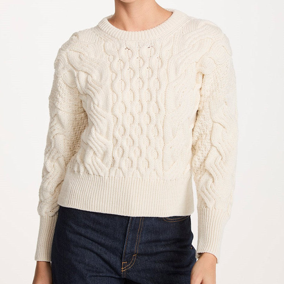 A new modern twist on the classic Aran is our super soft, chunky cropped cable sweater. Cut shorter than our standard length, this cute crop sweater features our statement super chunky cable with generous honeycomb stitch at the centre. With a luxurious double 1x1 rib collar, long 1x1 rib cuffs and 1x1 ribbed hem. For a trendy modern look, style this cropped sweater with high-waisted bottoms such as flared jeans or trousers, which will create a flattering balance. Alternatively, wear over a dress or with a skirt for a more dressed-up option. Elevate further with accessories such as a statement belt, layered necklaces and boots. Knitted in our own factory in Ireland using 5-gauge 100% Supersoft Merino. Knitted & Designed in Ireland.