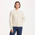 This lofty, heavyweight Aran cardigan is a true celebration of texture and craftsmanship. Hand knitted in luxurious 3-gauge 100% Merino wool, it offers exceptional warmth while maintaining a soft, breathable feel. The relaxed silhouette, with raglan sleeves and no shaping, creates an easy, comfortable drape at a standard length. A striking patchwork of blackberry stitch, trellis stitch, and varied cable patterns gives the cardigan depth and individuality, while rope cable detailing woven through the double crew collar and cuffs adds extra character. Finished with rib-edged side pockets and a full antique brass metal zip with an elegant ball pull, every detail reflects premium quality. Smooth, fully linked seams complete this beautifully crafted Irish knit.