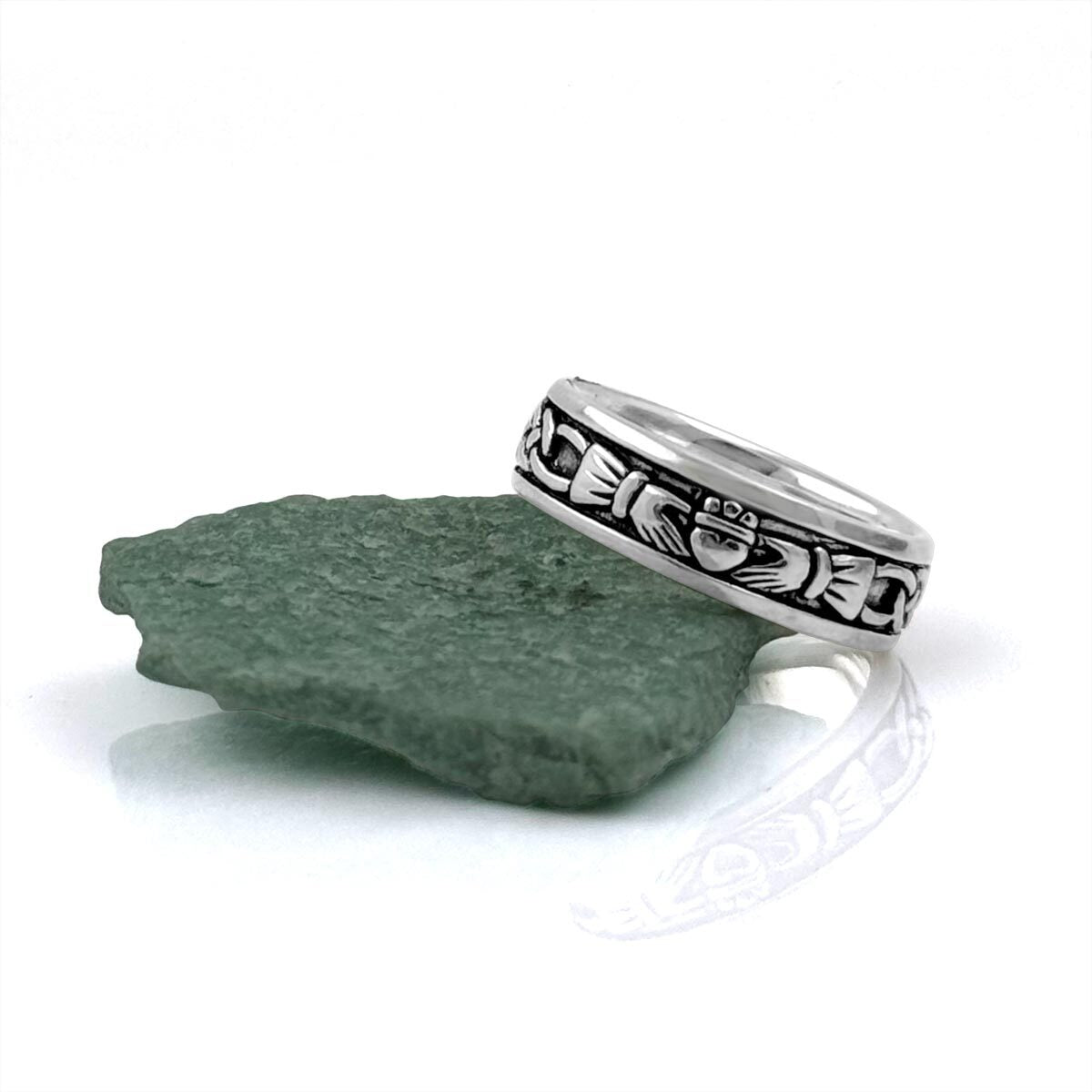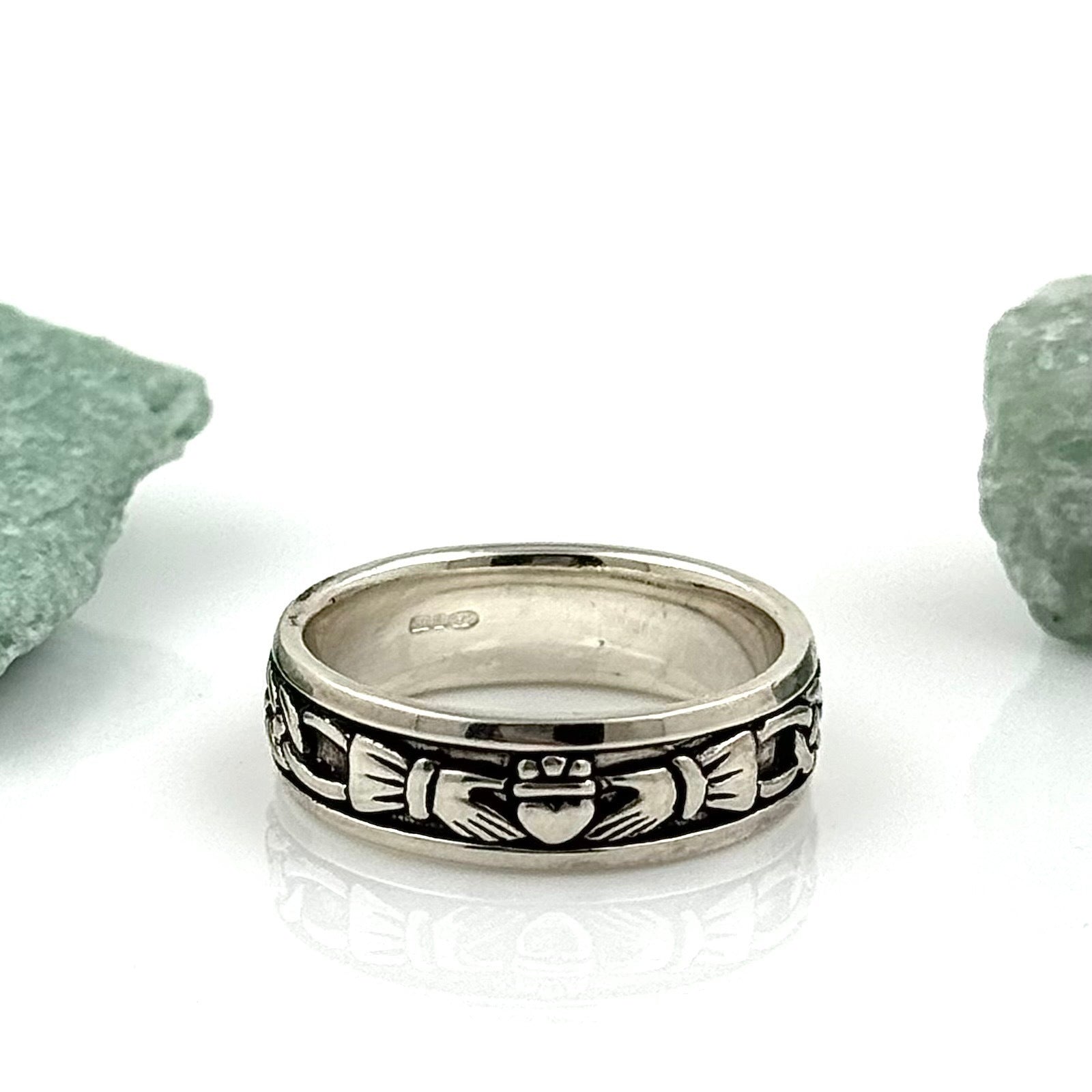 Introducing our Ladies Oxidised Silver Claddagh Band, a unique expression of Irish tradition and craftsmanship. This stunning Claddagh Band is crafted from oxidised sterling silver, giving it a distinct, antique finish that highlights the intricate Claddagh design —symbolizing love, loyalty, and friendship. The heart, hands, and crown of the Claddagh are beautifully detailed, making it a meaningful and stylish addition to any collection.