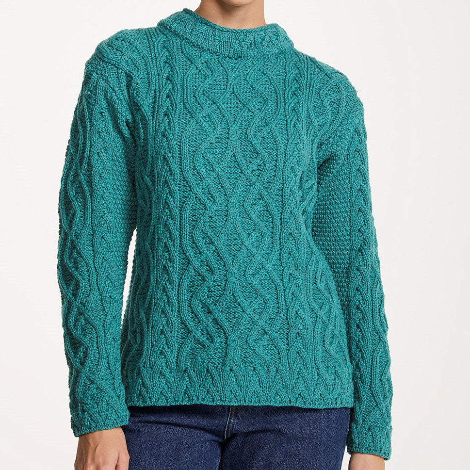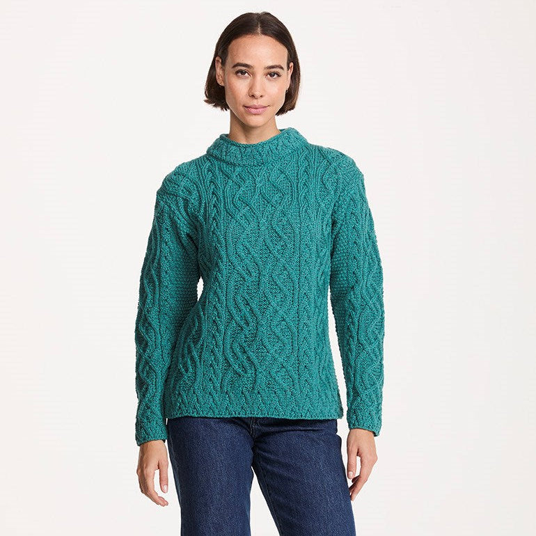 This feminine sweater has been designed with a fitted shape for a flattering silhouette, while highlighting the intricate Celtic trellis patterns. At the central panel, the trellis stitches intertwine, weaving their way through the sweater, while rope cables frame either side. A new neckline features interwoven cables, echoed on the cuffs and hem. Create a pretty, feminine, yet casual look by teaming with a mini skirt; alternatively, pair with a longer, flowing skirt for a more romantic vibe and complete the look with heeled boots. Alternatively, simply wear with your favourite jeans over a plain T shirt. Knitted in our own factory in Ireland in 5-gauge 100% Merino. Knitted & Designed in Ireland.