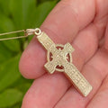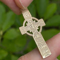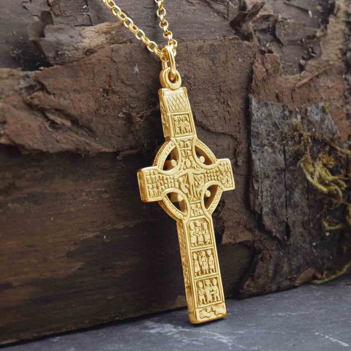 This beautiful gold Celtic Cross Pendant faithfully captures all of the detail of the original Saint Muirdeach’s cross at Monasterboice. The Cross of Muiredach at Monasterboice in Co. Louth is one of the most beautiful of the Irish High Crosses still standing. At the base of the West side can still be seen the inscription in Irish, OR DO MUIREDACH LASNDERNAD IN CHROS, which when translated reads, A prayer for Muiredach, for whom this cross was made. Most scholars think that this applied to Muiredach, son of Domhaill, an abbot of Monasterboice who died about AD922.
