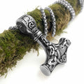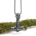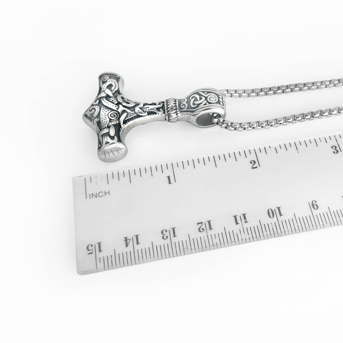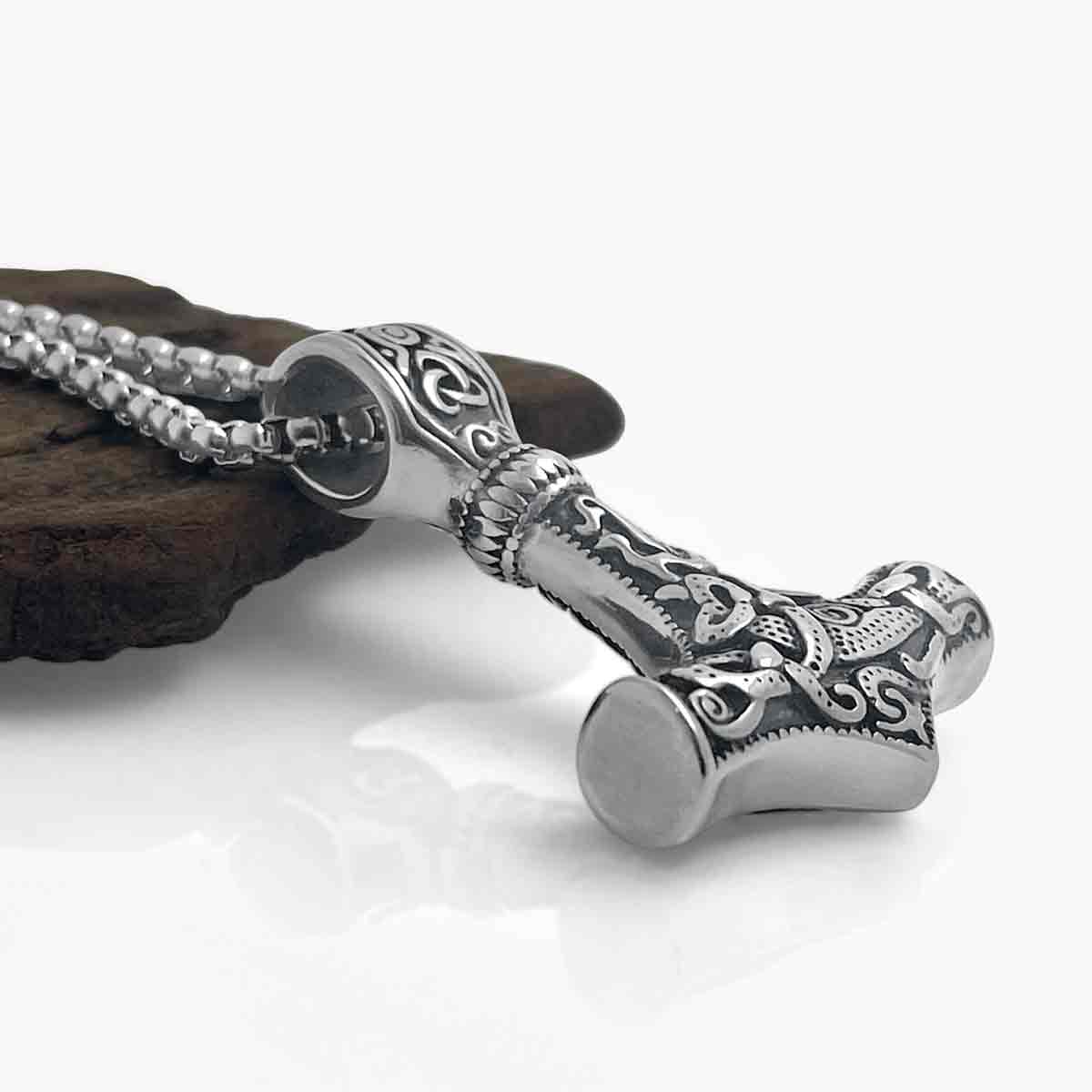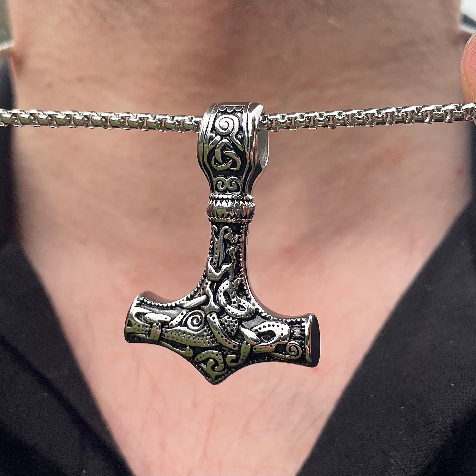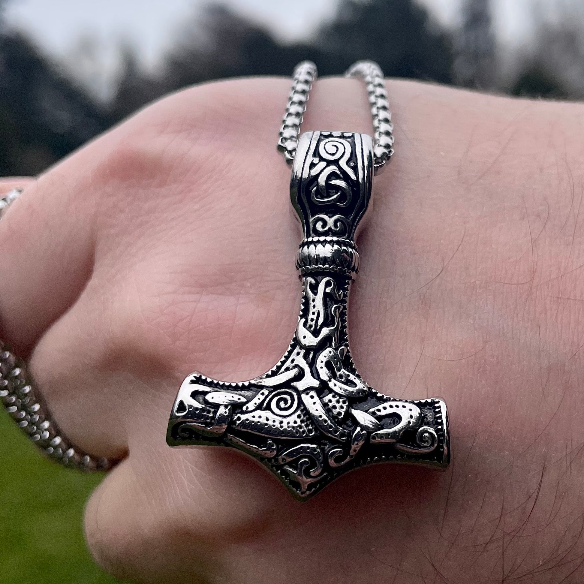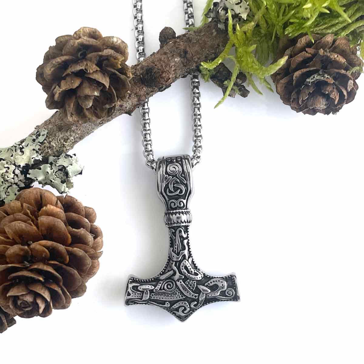 Crafted in Ireland from durable stainless steel, this Mjölnir pendant features intricate Nordic engravings and a sleek, slender handle, but with Trinity Knotwork too to connect Irelands Viking past.