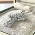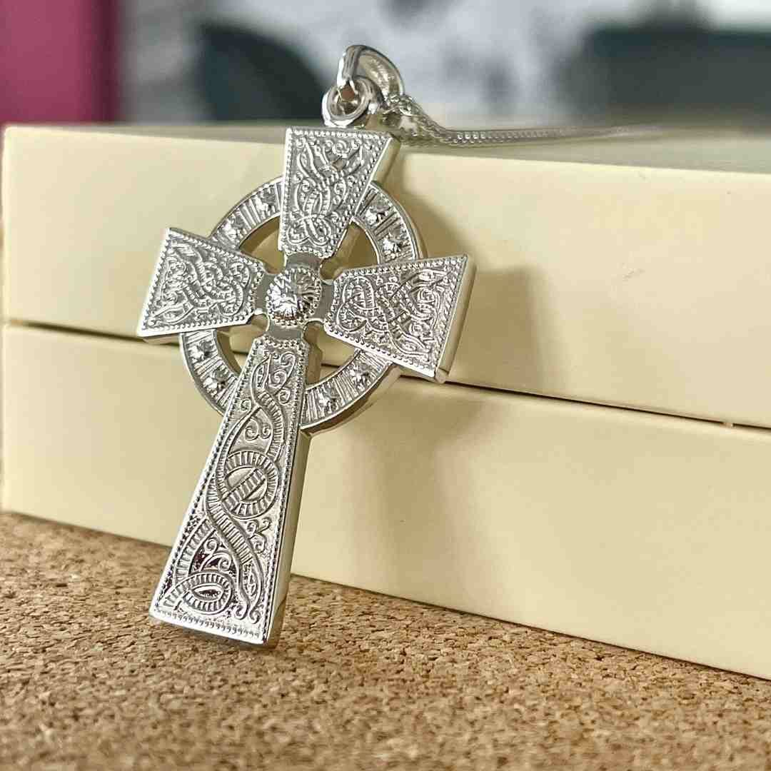 This Silver Celtic Warrior Cross is etched with historic symbols. Step back in time and feel the history, culture and honor in each piece. For the warrior in your life, this is the perfect gift. The design of the cross is inspired by Ireland's warrior past. Long ago, warriors used to enter battle with symbols such as family crests on their shields. The warrior spiral design was prominent here. The rhodium plating finish gives this Celtic cross pendant a distinct look for the male or female wearer.