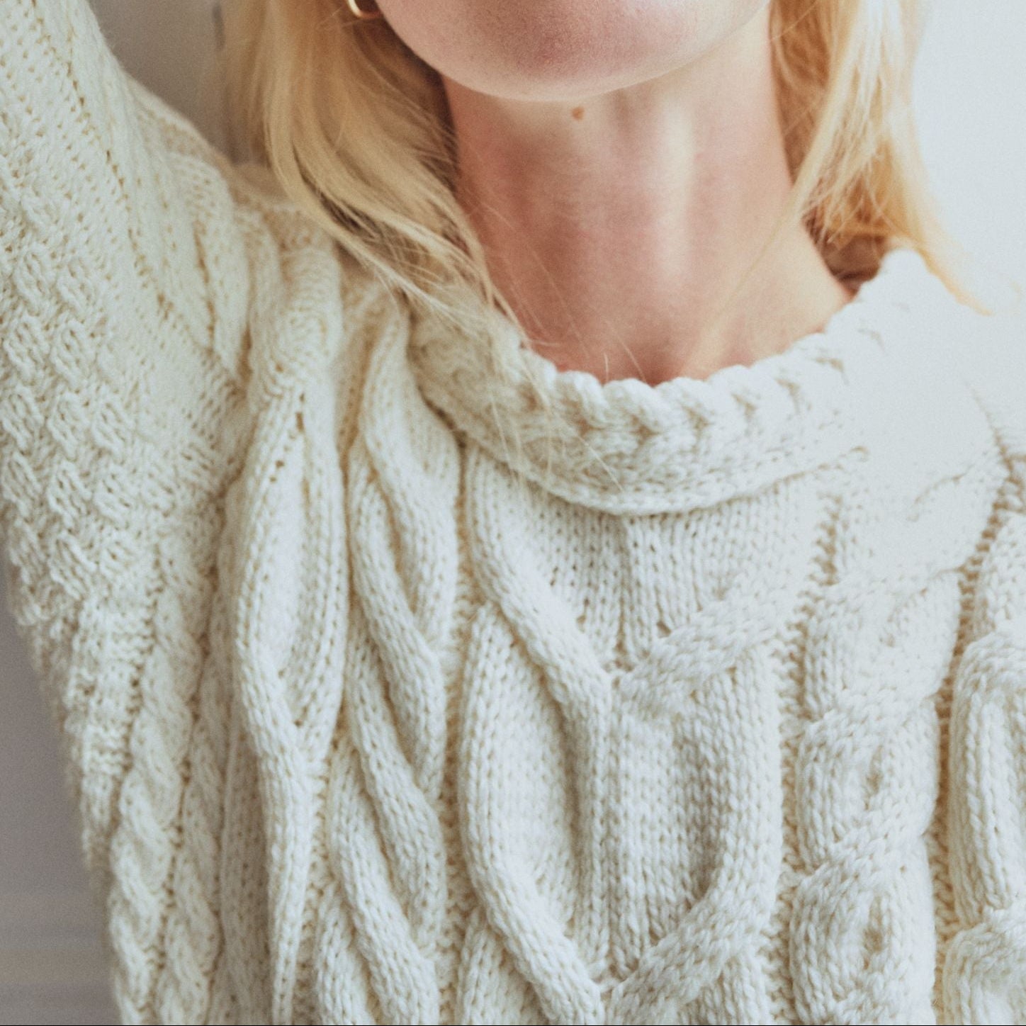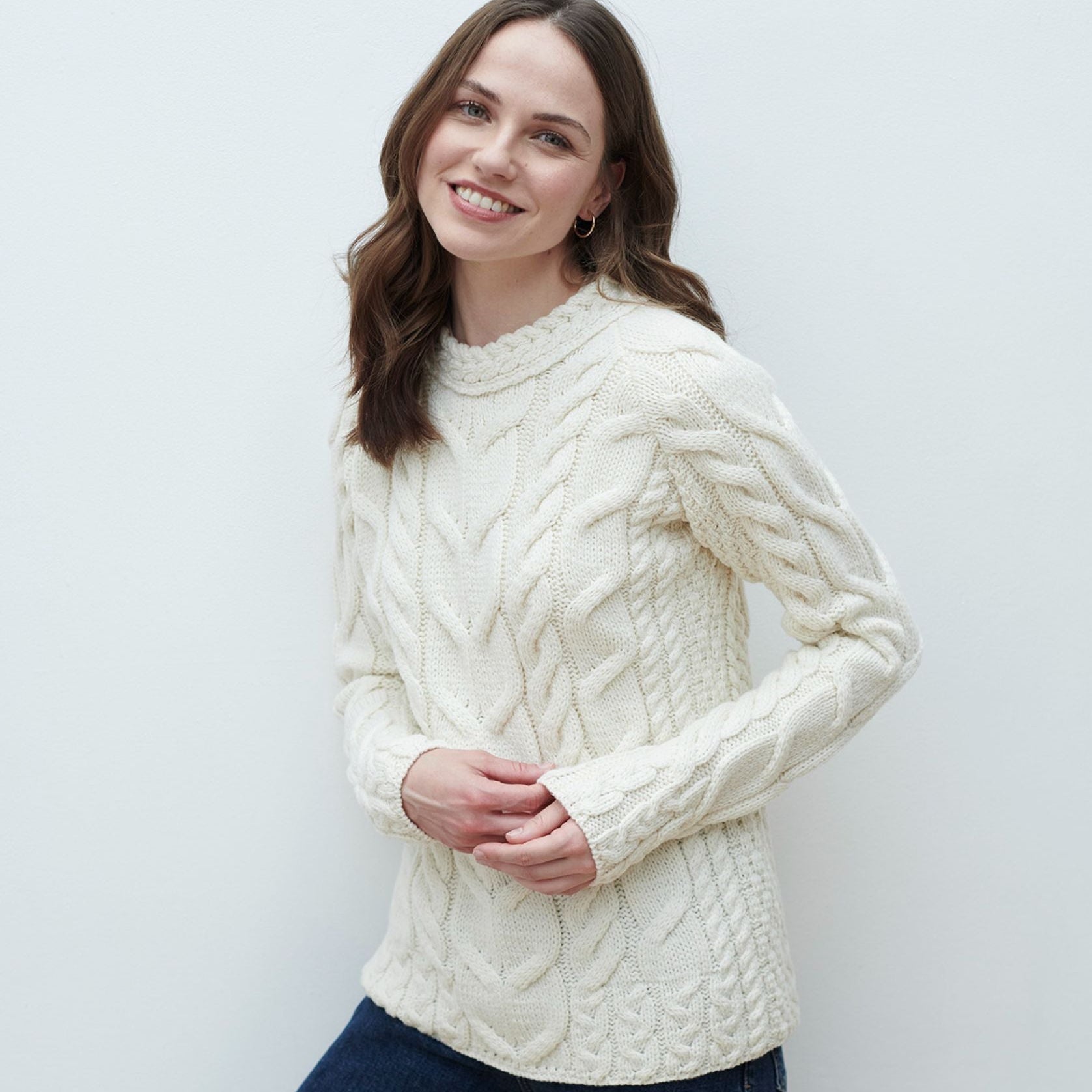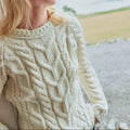 Experience the perfect blend of tradition and modern style with the Listowel Ladies Aran Cabled Sweater. This exquisite piece from Aran Woollen Mills is crafted from luxurious Supersoft Merino wool, offering unparalleled comfort and warmth. Featuring a variety of traditional Aran stitches, including chunky cables and the classic trellis pattern, this sweater provides a flattering silhouette with its neat raglan sleeves and gentle side fitting. Made in Ireland, it promises both quality and timeless elegance.