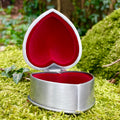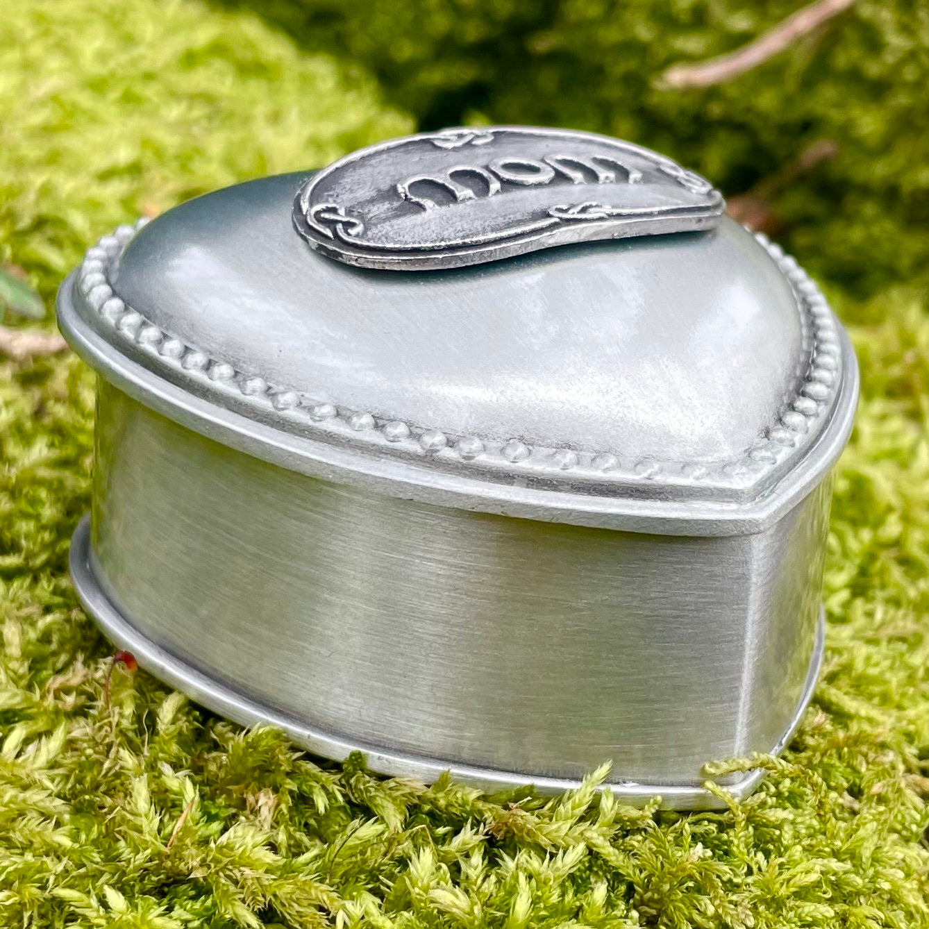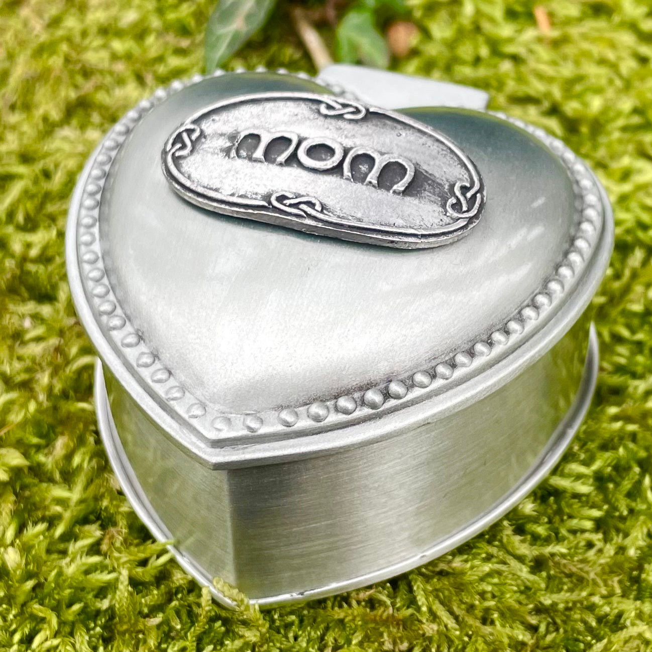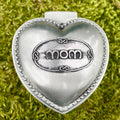 This charming handcrafted Mullingar Pewter heart-shaped jewelry box is embossed with 'Mom'. It's perfect for storing jewelry and trinkets. The interior is lined with velvet for an added touch of luxury.