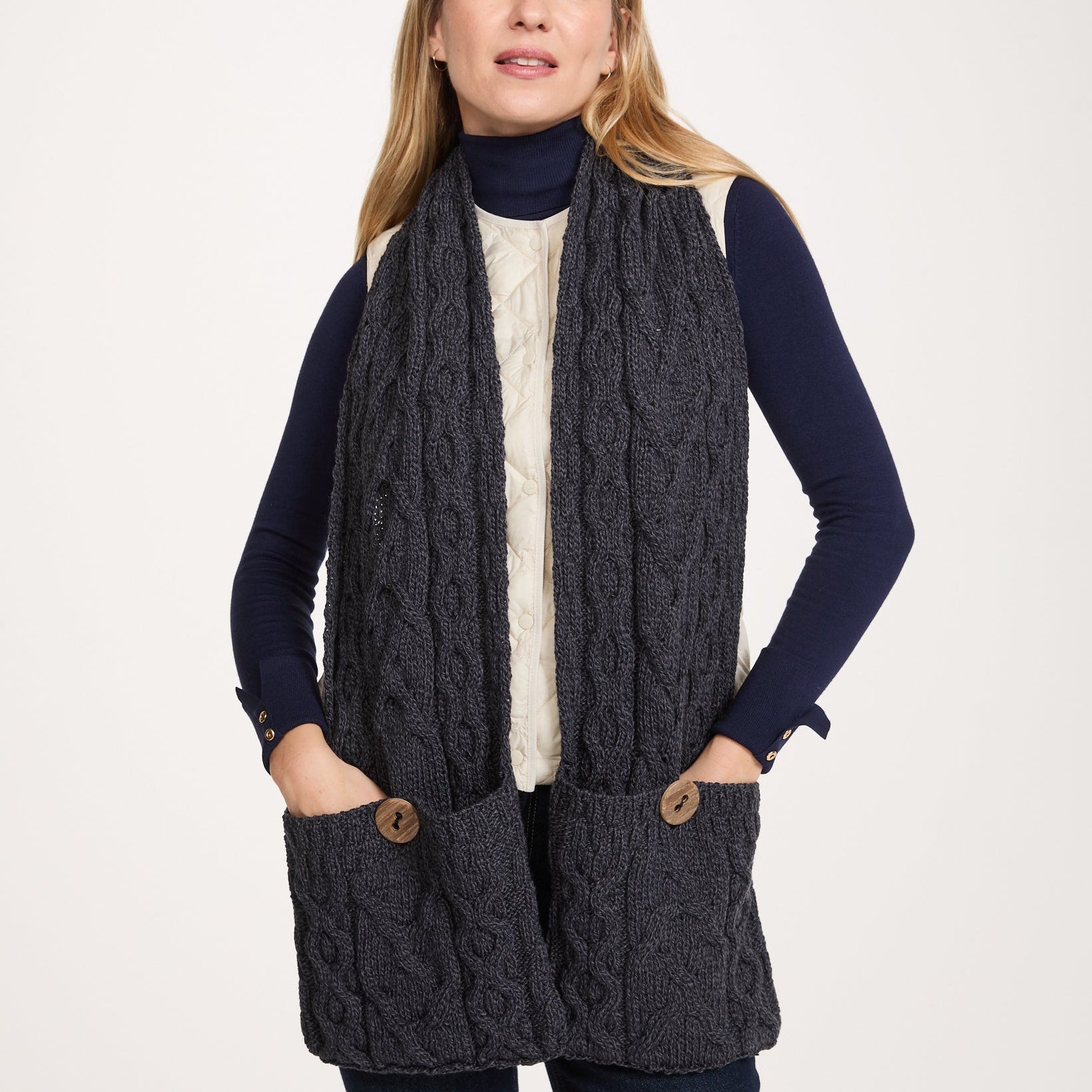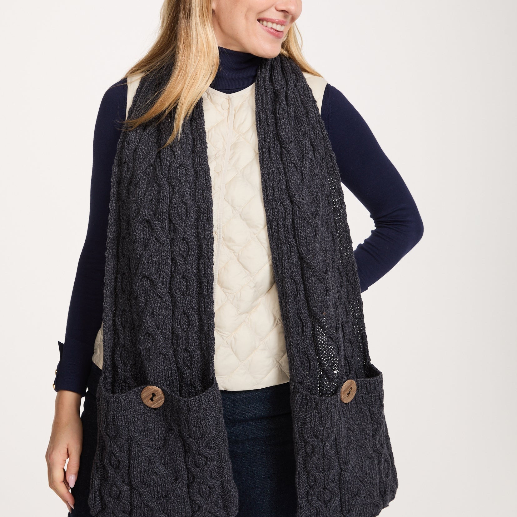 Enhance your winter wardrobe with the elegant and practical Moy Aran Pocket Scarf. Expertly crafted from 100% premium wool, this scarf combines timeless Aran design with modern functionality. Its soft, luxurious texture and intricate stitching make it a perfect accessory for staying warm and stylish in any setting.