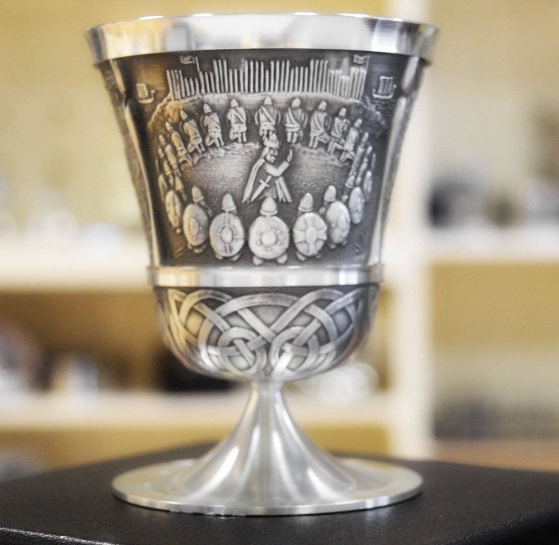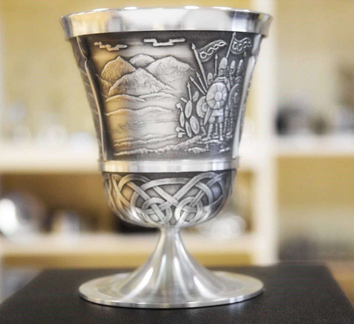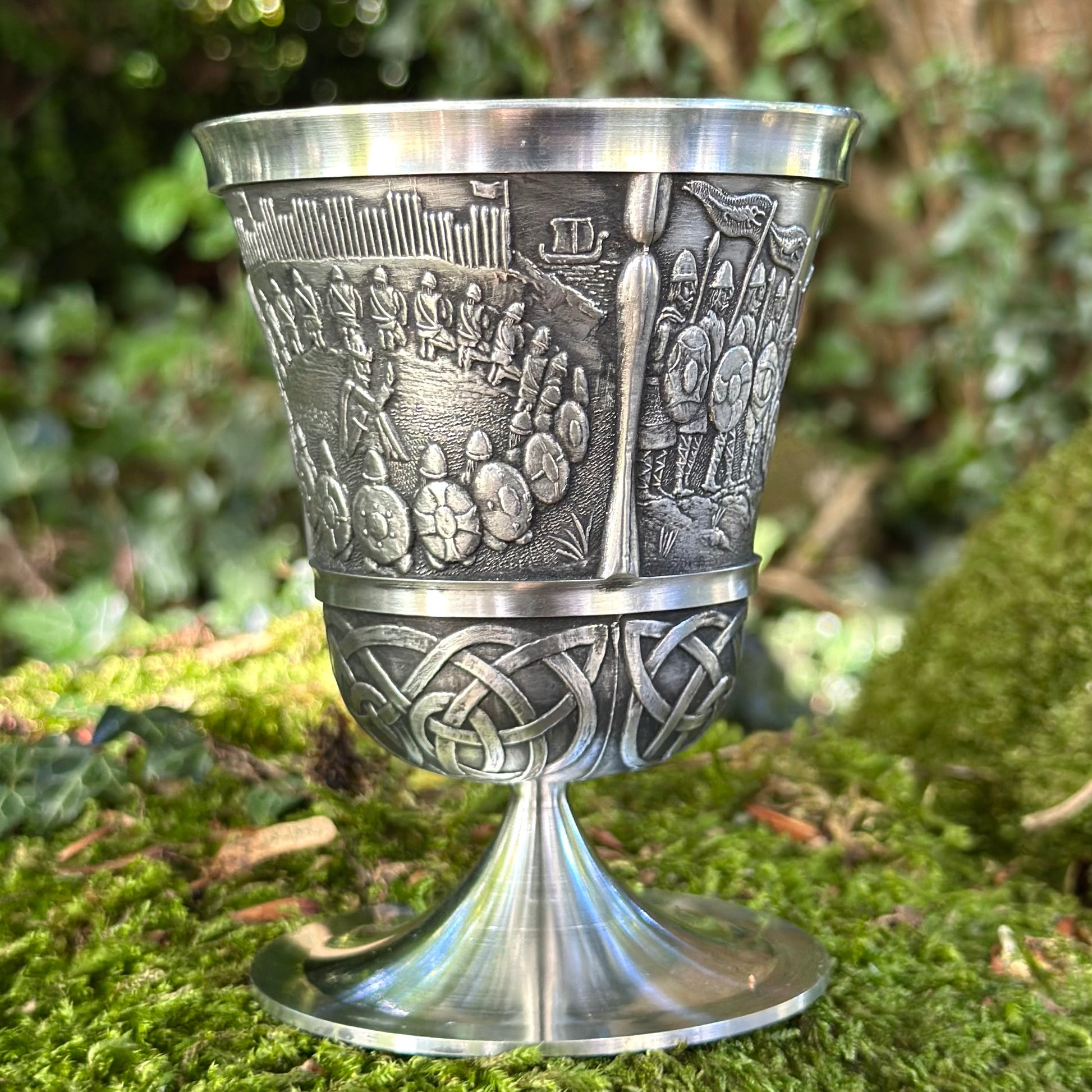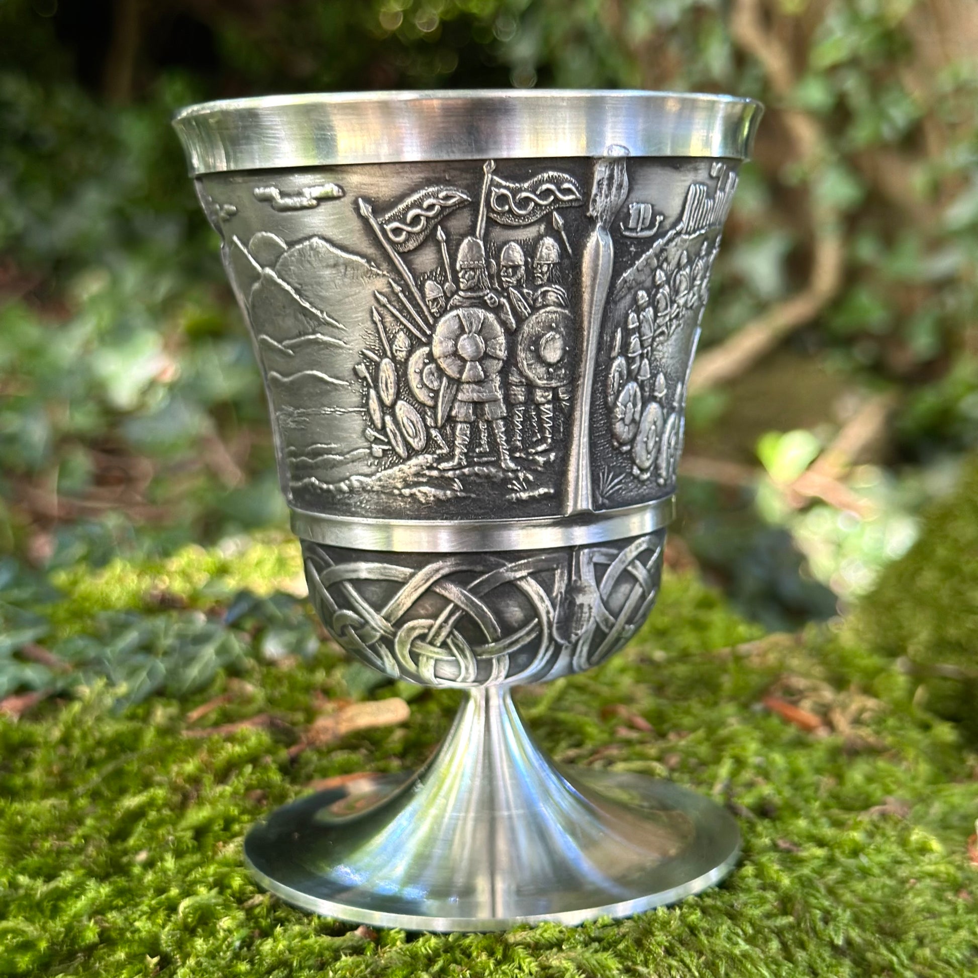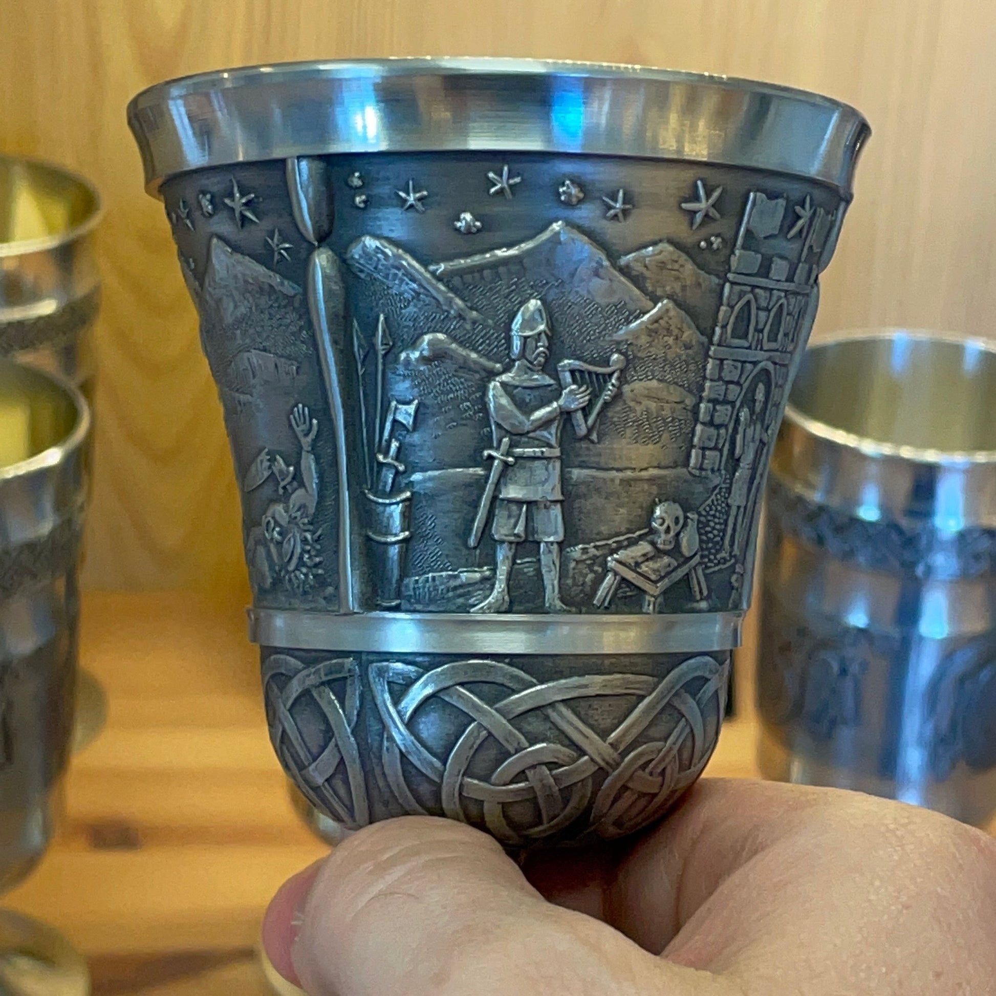 This beautiful handcrafted Mullingar Pewter beaker tells a story from ancient mythical Ireland, featuring a design of Brian Boru. A perfect gift hearkening back to one's Irish heritage, and can be used for ale, beer, or any beverage of your choosing.