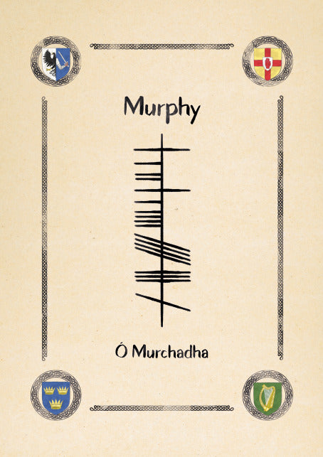 This Ogham print is a personalized Irish gift. The print contains the four shields at each corner. These are the shields of the four provinces of Ireland; Ulster, Munster, Connaught and Leinster. Contained within the Celtic spiral borders are: