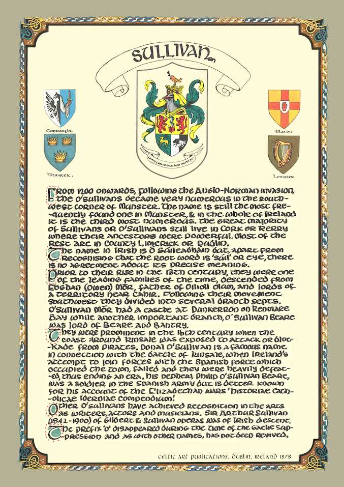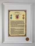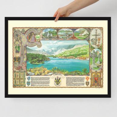 Framed large Print: 18" x 24". Displays the crest, family history and Ireland illustration.