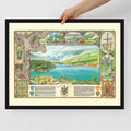 On this parchment, the Killarney lakes take center stage above the heraldic shield whilst many Irish Celtic symbols and famous monuments surround it.