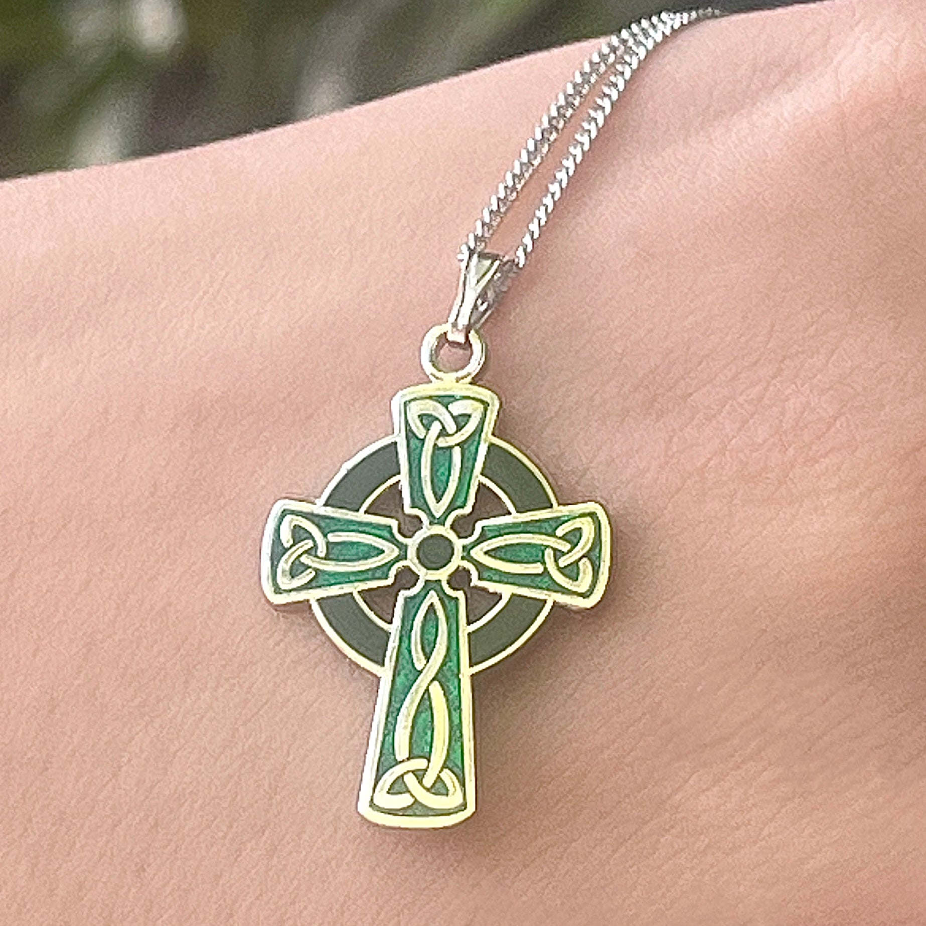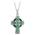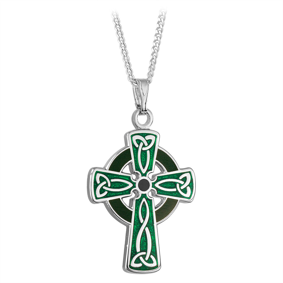 Wear Your Heritage with Grace: Rhodium Green Enamel Celtic Cross Pendant