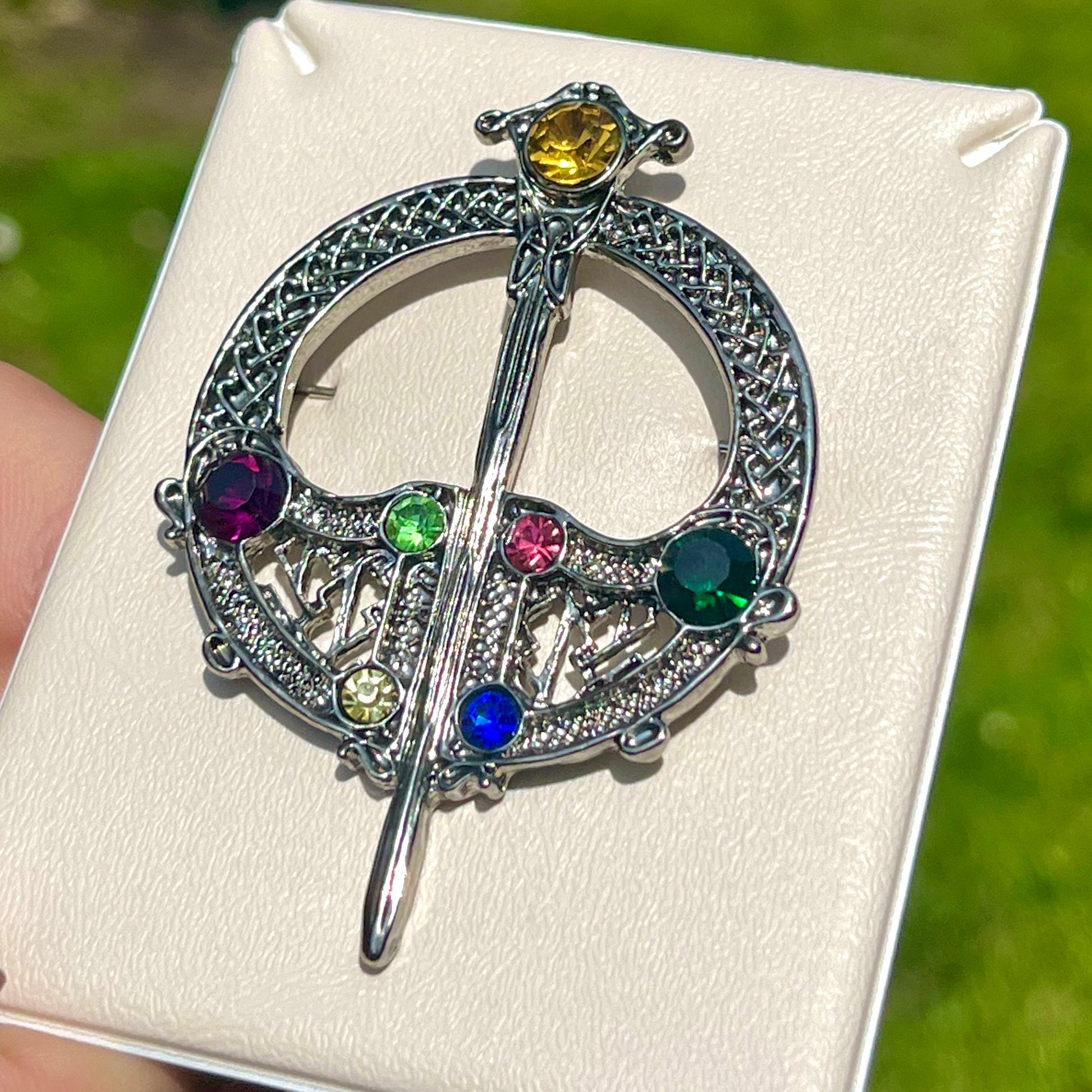 Adorn yourself with our Rhodium Plated Tara Brooch, embellished with Multicoloured Crystal Glass. Meticulously crafted, this brooch beautifully marries rhodium-plated metal with intricate patterns and sparkling crystals. Measuring 1.89 inches in width and 2.76 inches in height, it weighs 24.85 grams. This stunning accessory harmoniously blends Celtic heritage with contemporary elegance, epitomizing Ireland's rich history in a modern context. Experience the magic of tradition and glamour with the Tara Brooch.