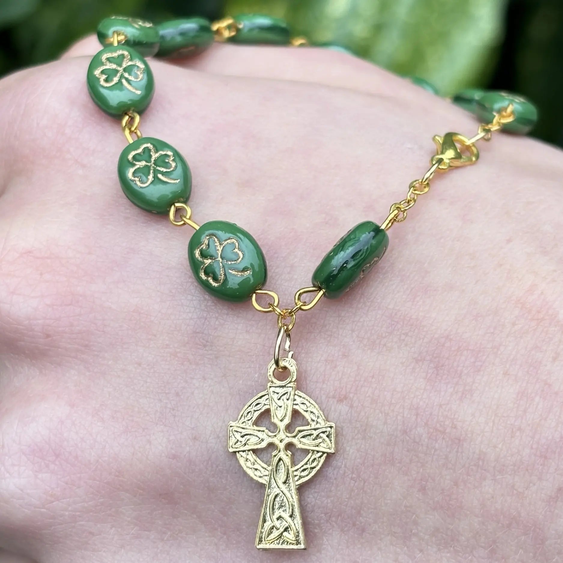 Made with high-quality beads, the bracelet includes a cross charm and ten small beads, representing the decades of the rosary, making it perfect for prayer or daily wear. The shamrocks add a meaningful touch, reminding you of the rich cultural roots of Ireland while practicing your faith. Designed for both style and purpose, this bracelet is a thoughtful gift or a meaningful accessory for yourself.