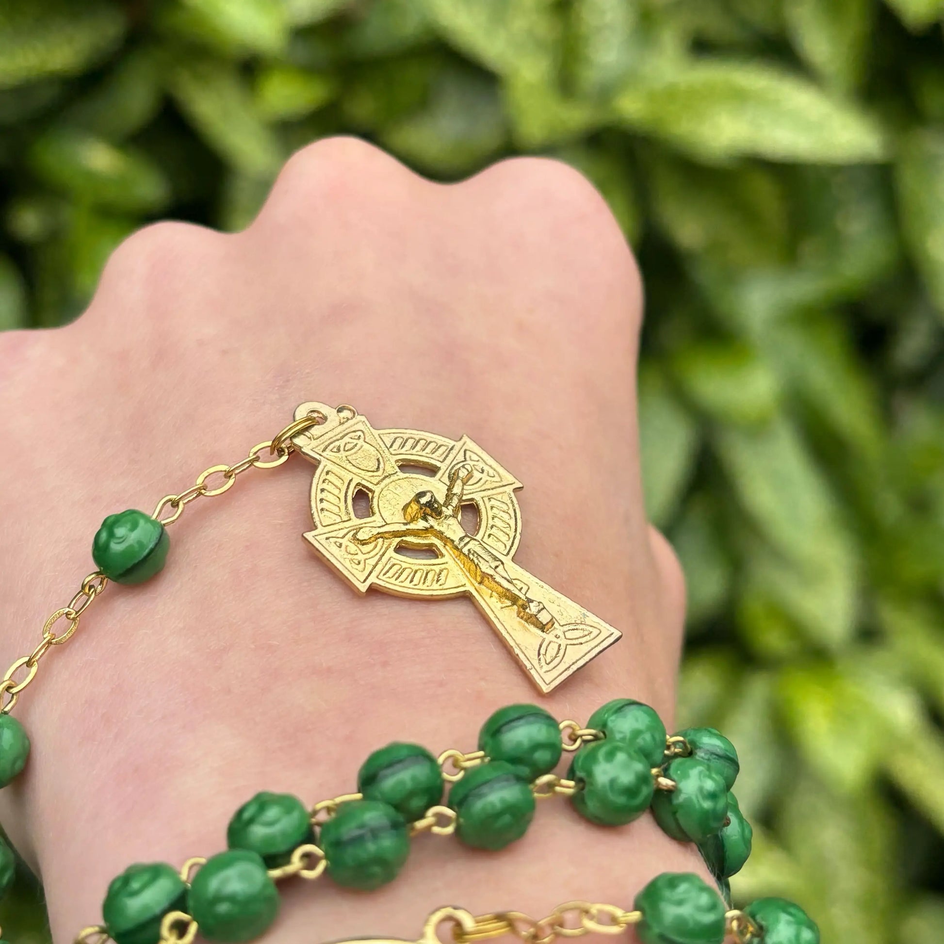 Gilt Shamrock Rosary Beads With Knock Water Center, a Celtic cross and Trinity knot details.