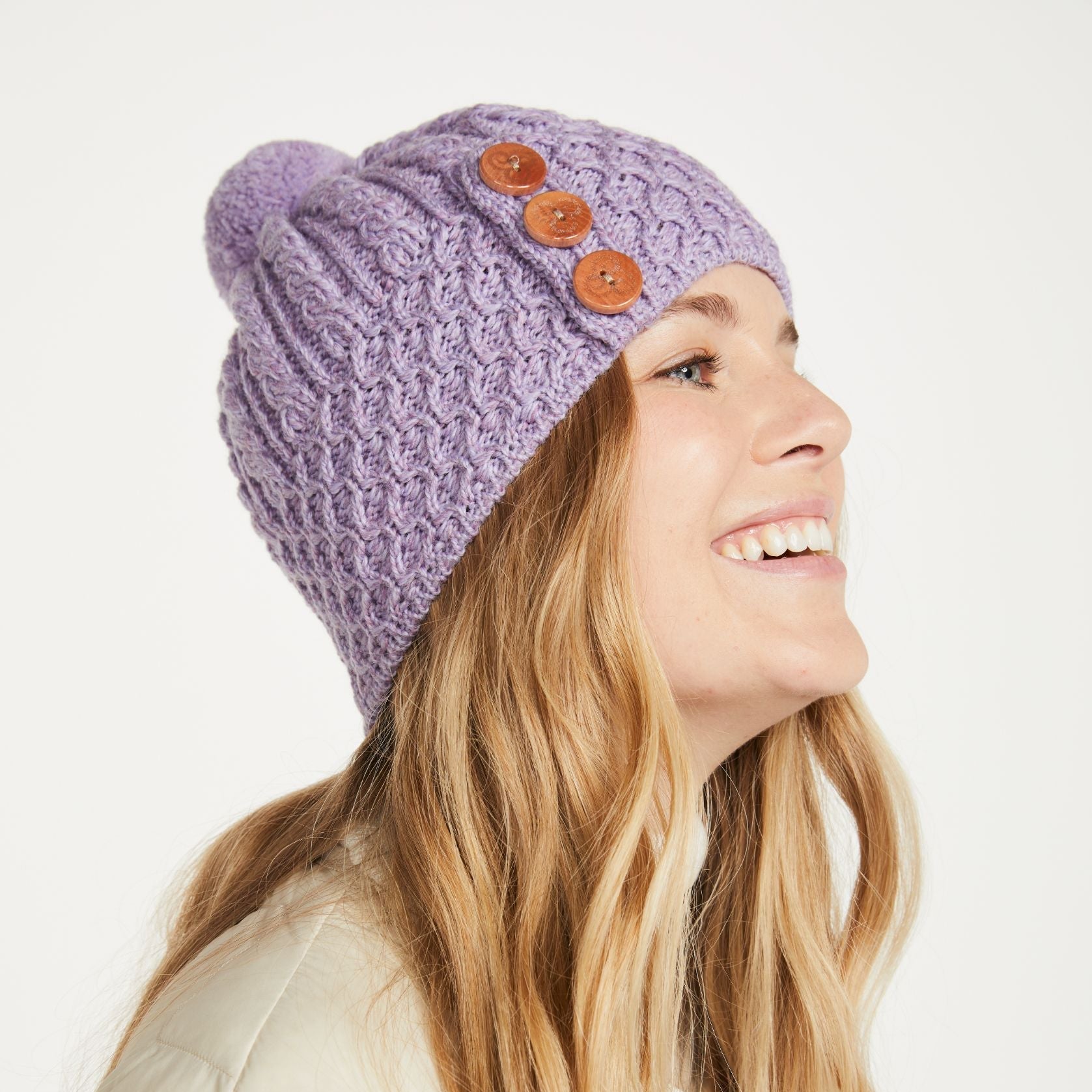 Stay warm and stylish with the Shrule Aran Hat with Pom Pom. Expertly crafted from 100% merino wool, this hat combines the rich heritage of traditional Aran stitching with modern design elements. The luxurious wool ensures exceptional softness and warmth, making it the perfect accessory for chilly days.