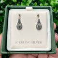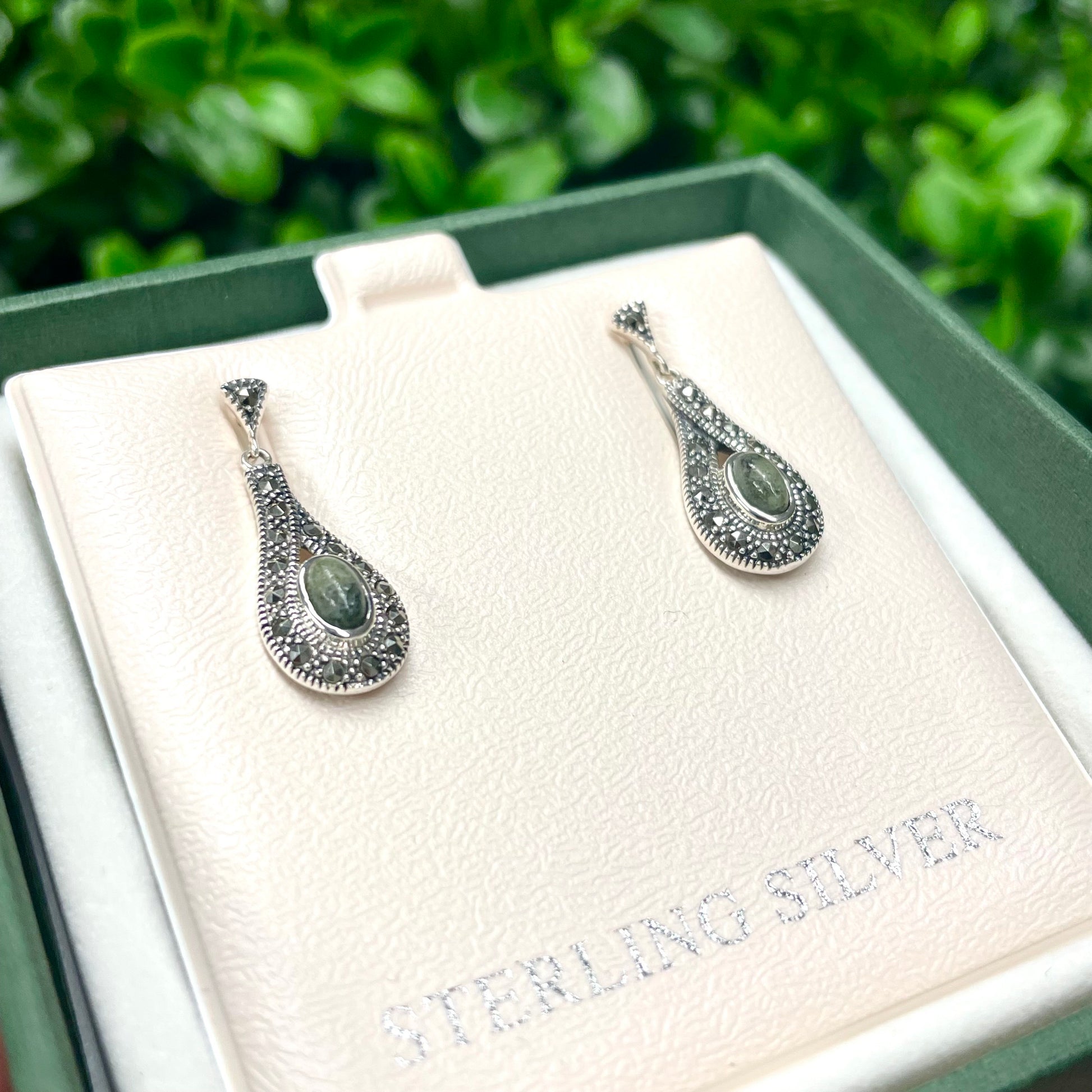 These beautiful earrings have been crafted in sterling silver with Connemara marble and embellished with marcasite for an added sparkle. Connemara Marble is referred to as "Ireland's Gem Stone". It is a very unique and rare form of Marble found in valley of the 12 Bens in Connemara, the heart of the West of Ireland. This beautiful marble, estimated to be over 900 million years old, gets its range of green colour tones from the various natural elements only found in the limestone in this remote and rugged region on Irelands Atlantic Coast.