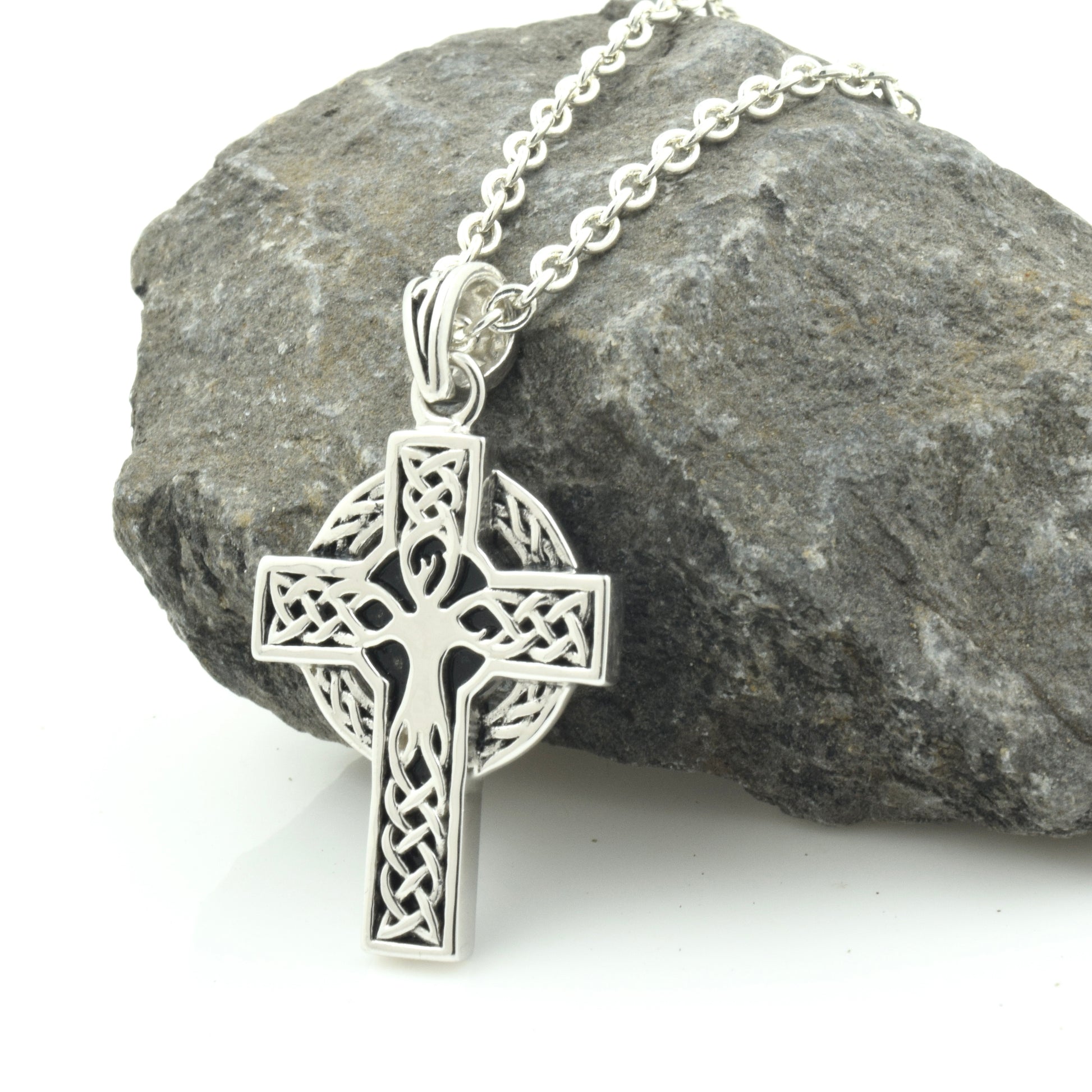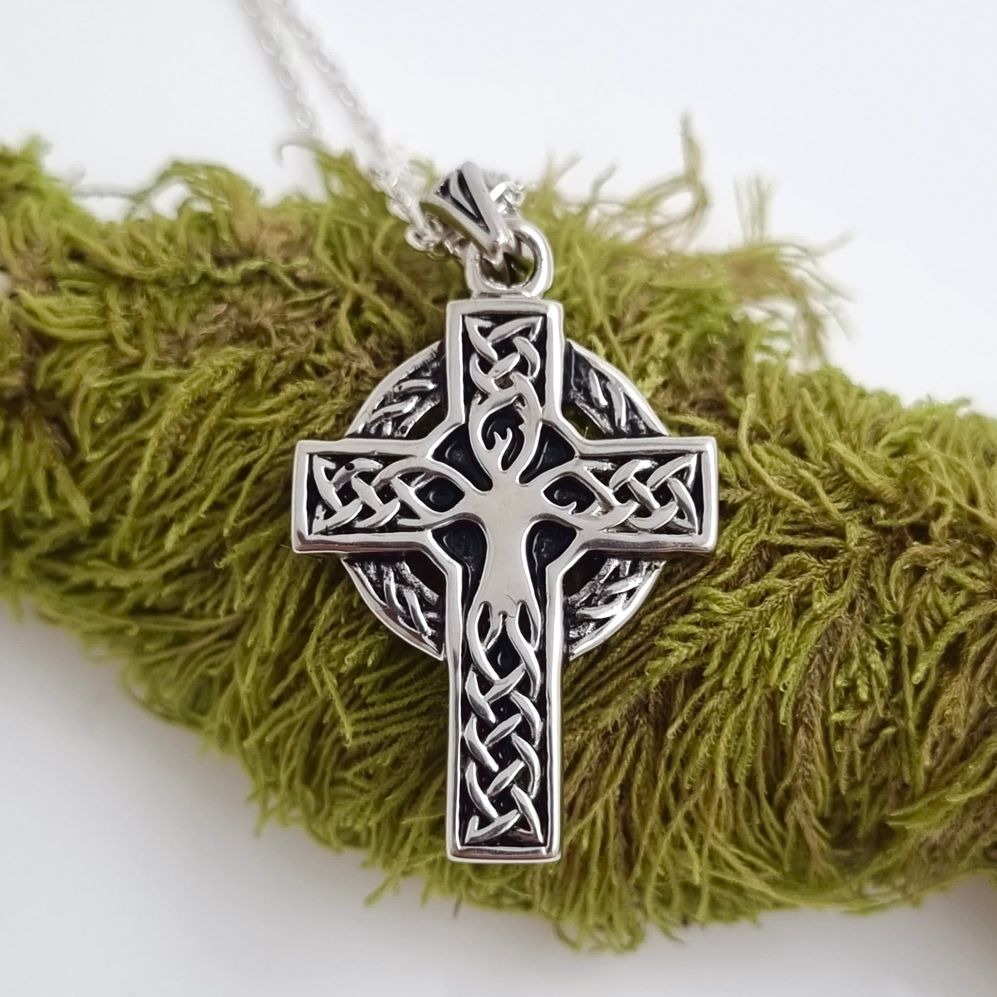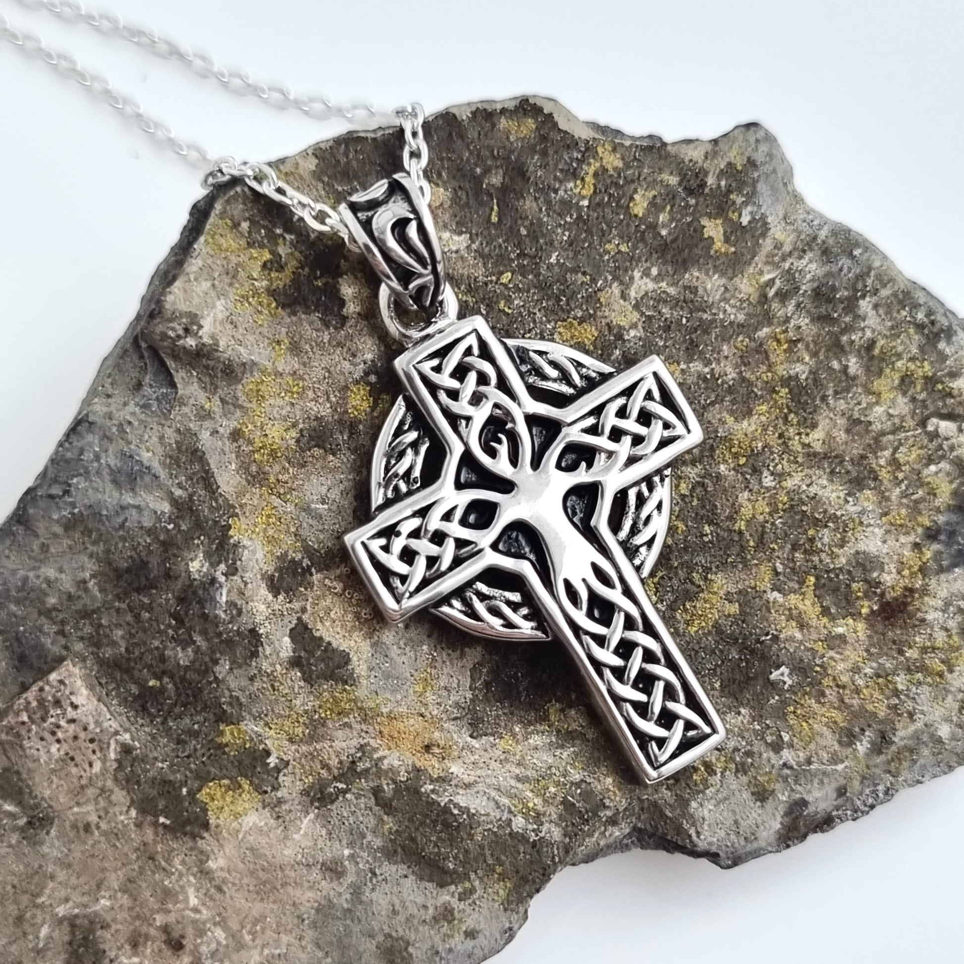 This Richly ornamented Celtic cross is a timeless emblem of faith and divine protection. What makes it unique Is that it incorporates the Tree of Life into it.