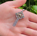 This two tone Celtic cross pendant is handmade with 10k Gold with sterling silver surround. The detail of the design makes this cross necklace a special piece. It contains intricate ancient Celtic Knotwork and a contemporary mix crafting gold and silver elements. The pendant comes with comes a heavy 20” oxidized sterling silver curb chain. All of our Celtic jewelry is hallmarked by the Assay office in Dublin Castle.