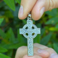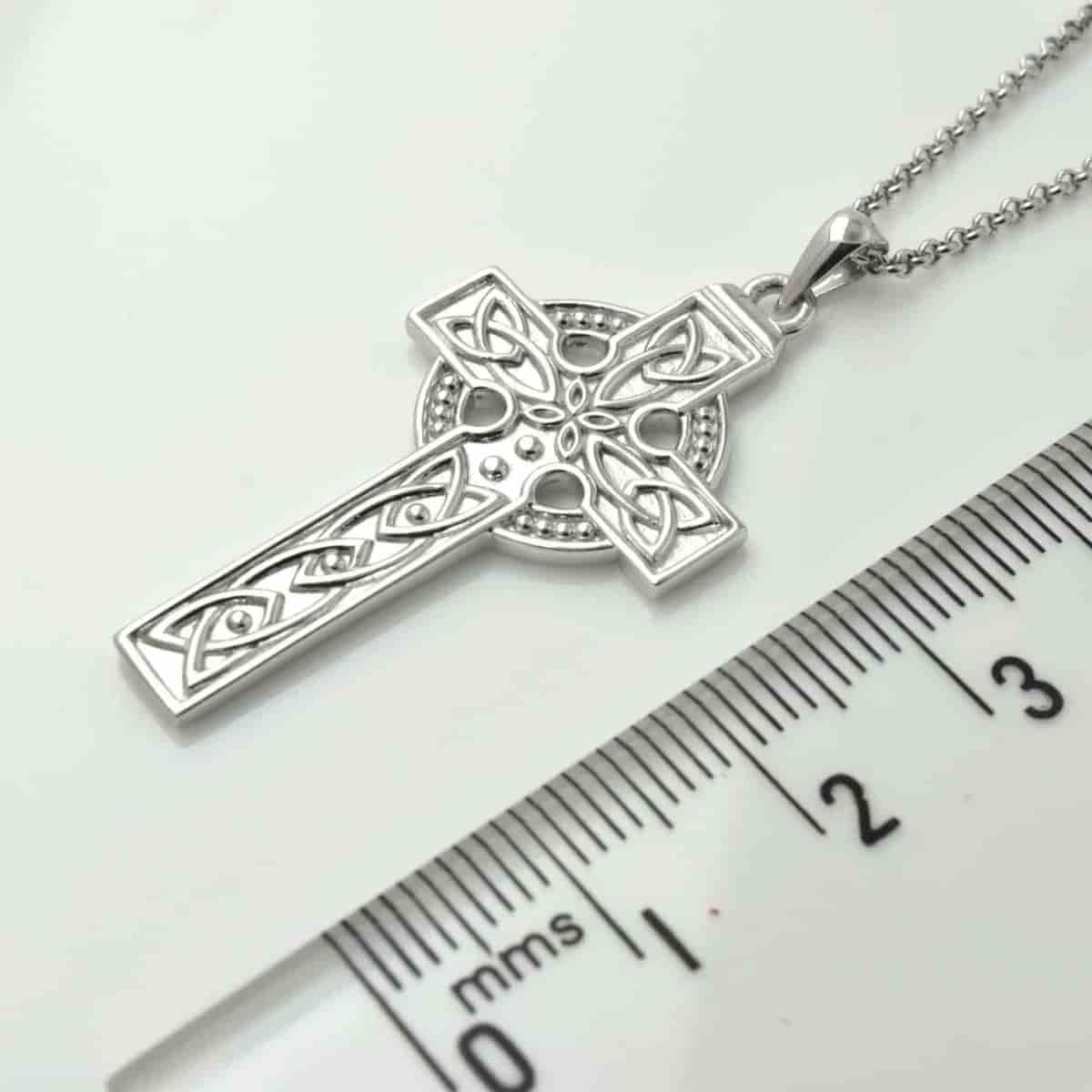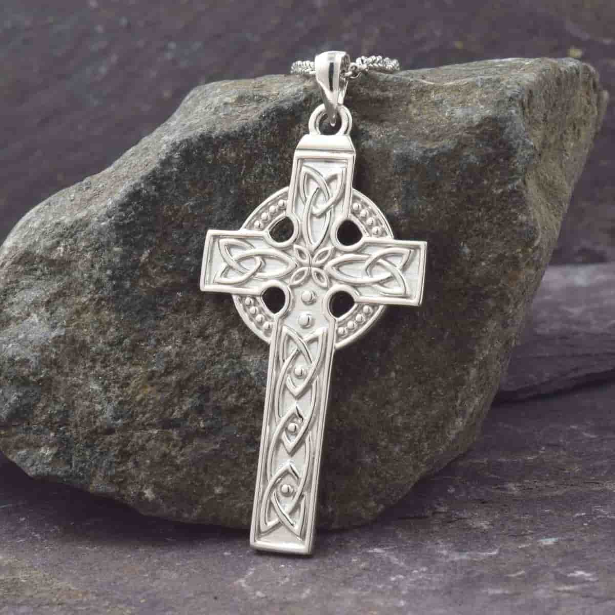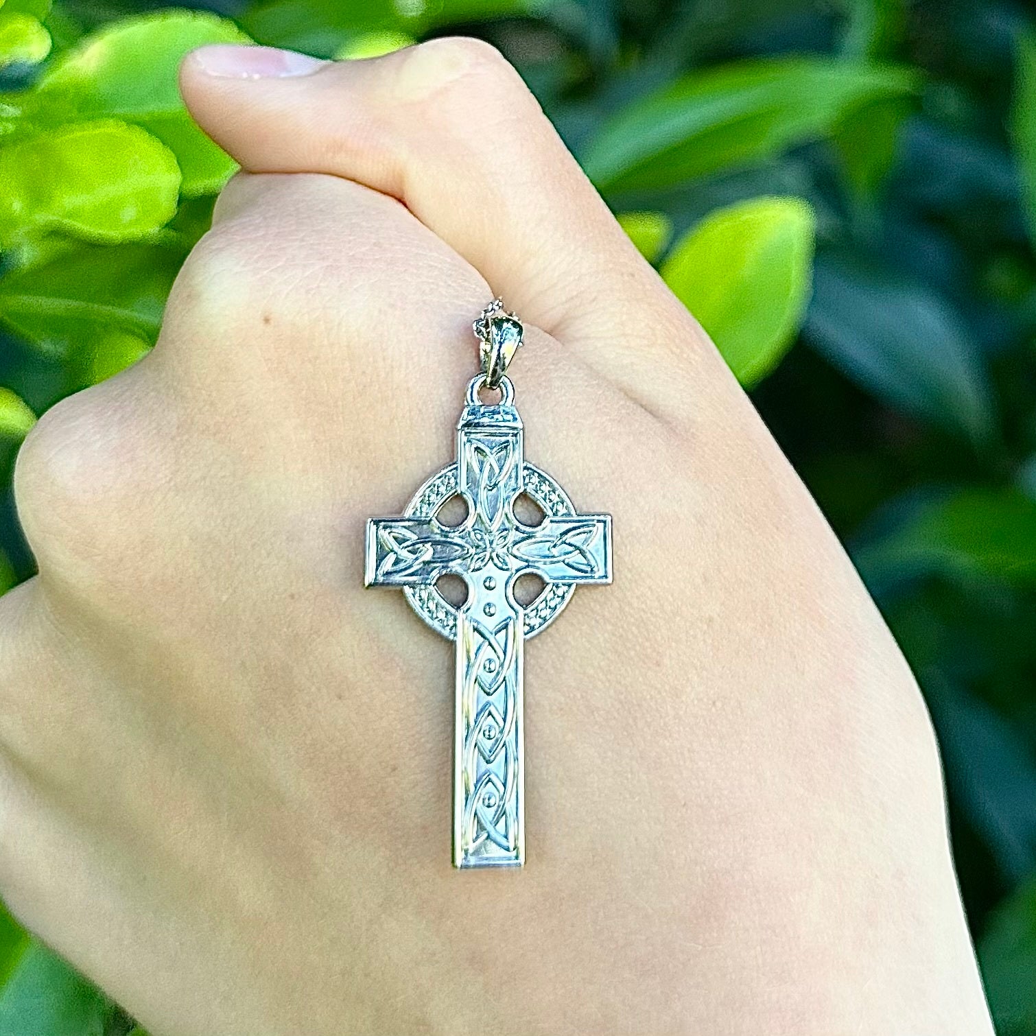 This is a beautiful sterling silver Celtic cross that is perfectly proportioned to be worn by a man. It features an intricate trinity knot design that pays homage to the Irish High Cross legend and Irish heritage. This piece has been handcrafted in Dublin and hallmarked at the Irish Assay Office in Dublin Castle.