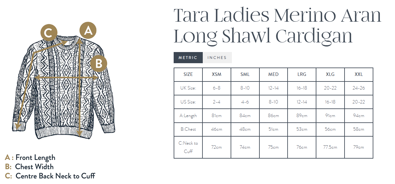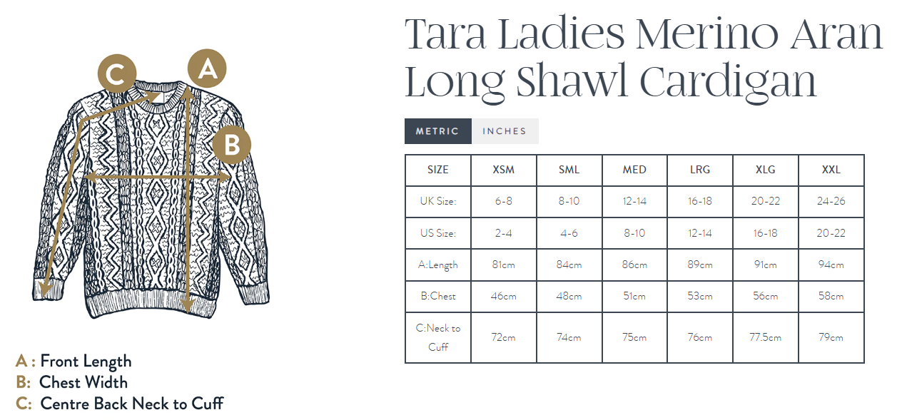The Tara Ladies Merino Denim Aran Long Shawl Cardigan is a beautifully balanced piece that brings together heritage and everyday comfort. Made from 100% Merino wool, it offers natural warmth while remaining breathable and soft to wear. The long, flowing shape creates an effortless silhouette, while the fold-over shawl collar adds both comfort and character. Detailed cables, diamond motifs, trellis stitch, basket weave, and moss stitch edges give the cardigan real depth and texture — a true celebration of traditional Aran knitwear. The denim shade keeps it versatile and modern, making it an easy piece to layer over dresses, jeans, or knit tops throughout the year.