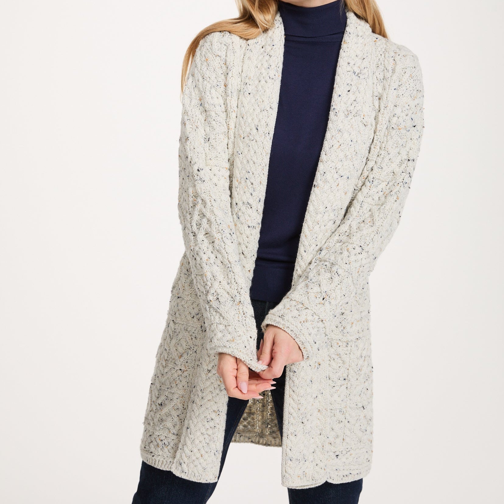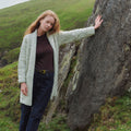 The Tara Ladies Merino Flecked Oat Aran Long Shawl Cardigan is a beautifully balanced piece that brings together heritage and everyday comfort. Made from 100% Merino wool, it offers natural warmth while remaining breathable and soft to wear. The long, flowing shape creates an effortless silhouette, while the fold-over shawl collar adds both comfort and character. Detailed cables, diamond motifs, trellis stitch, basket weave, and moss stitch edges give the cardigan real depth and texture — a true celebration of traditional Aran knitwear. The denim shade keeps it versatile and modern, making it an easy piece to layer over dresses, jeans, or knit tops throughout the year.