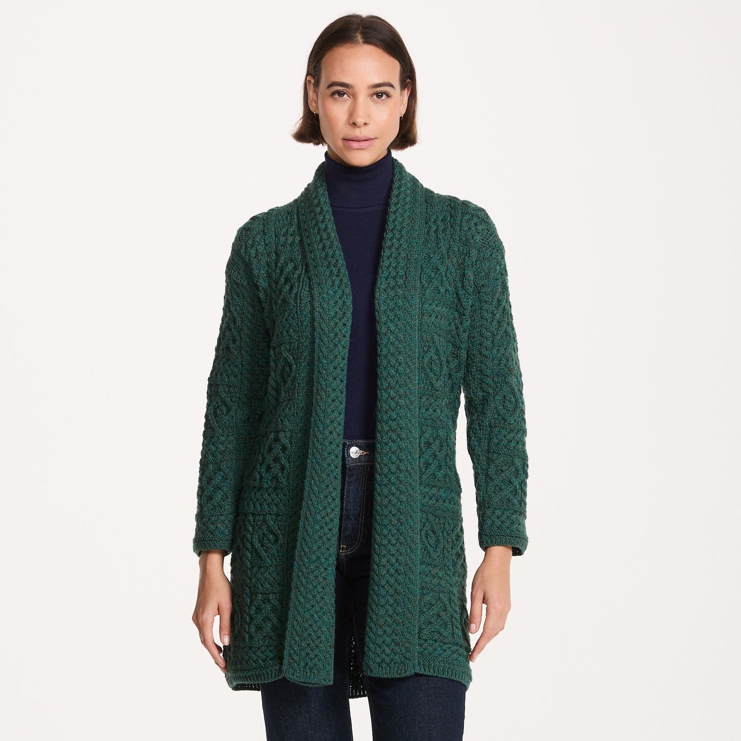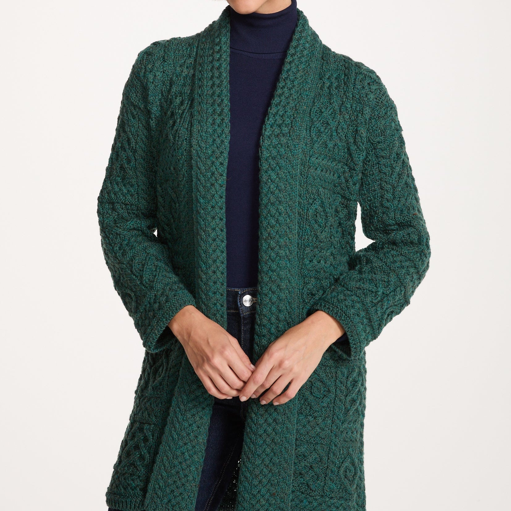 Tara Ladies Merino Green Aran Long Shawl Cardigan