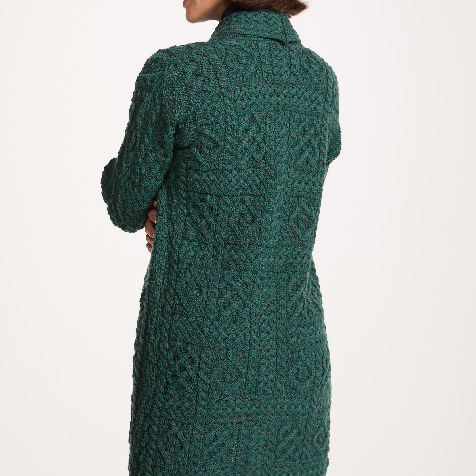 The Tara Ladies Merino Green Aran Long Shawl Cardigan is a beautifully balanced piece that brings together heritage and everyday comfort. Made from 100% Merino wool, it offers natural warmth while remaining breathable and soft to wear.