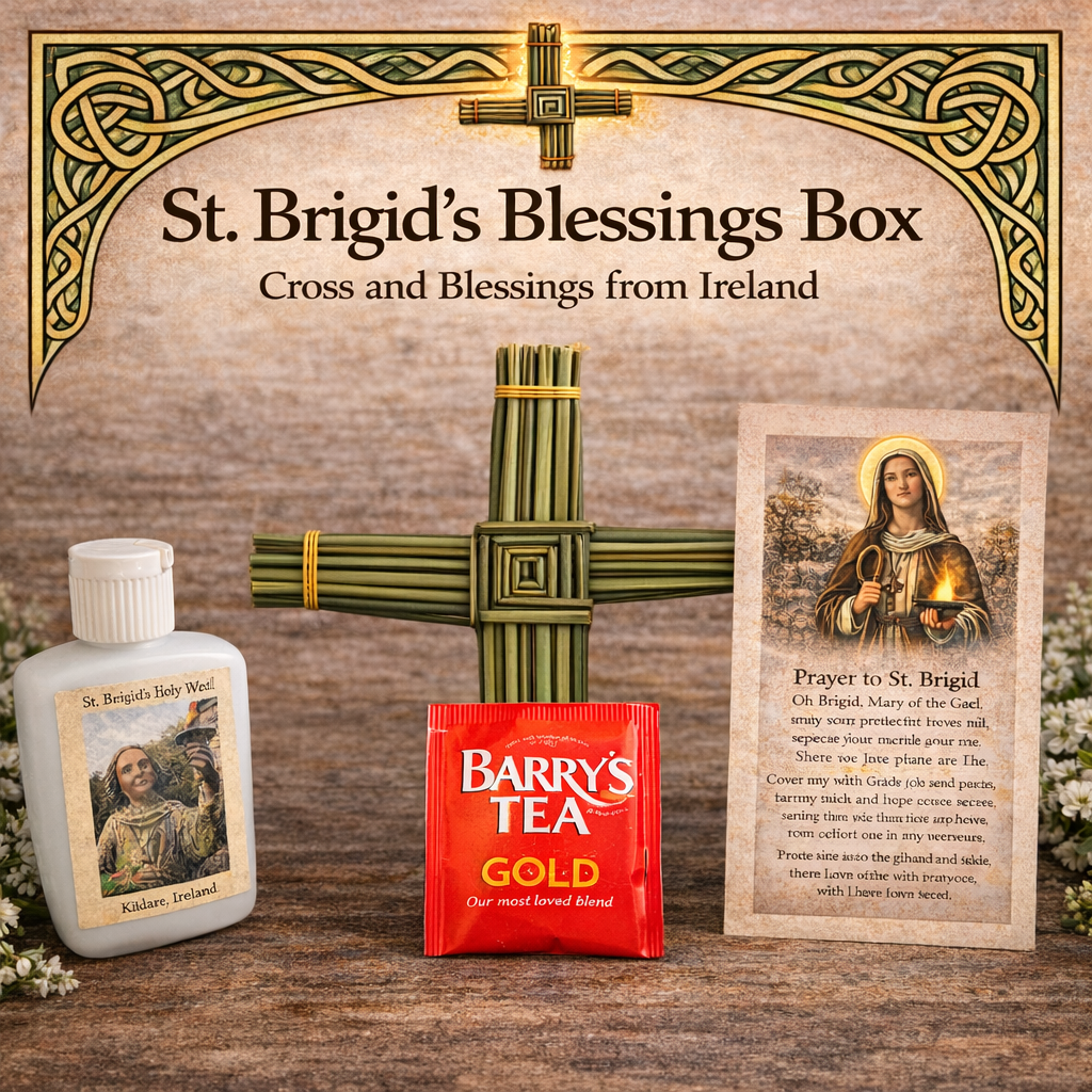 The box is completed with a Saint Brigid prayer card, offering words of comfort and devotion, along with a small Saint Brigid votive candle to light during prayer, remembrance, or reflection.