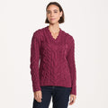 The Tralee Ladies V-Neck Berry Sweater is a refined piece of Aran knitwear with strong character and beautiful structure. Crafted from 100% Merino wool, it offers natural warmth with a soft, breathable feel that’s comfortable from morning through evening. The gently fitted cut creates a clean, flattering silhouette, while the sculptural cable knit flowing down the front adds depth and movement. An elongated central cable is framed with rope detailing, drawing the eye and giving the sweater a balanced, confident look. The V-neck is finished with double cable trim, and trellis patterns at the hem and cuffs complete the design with subtle texture and strength. The Berry shade brings warmth and individuality, making it easy to style while still standing out.