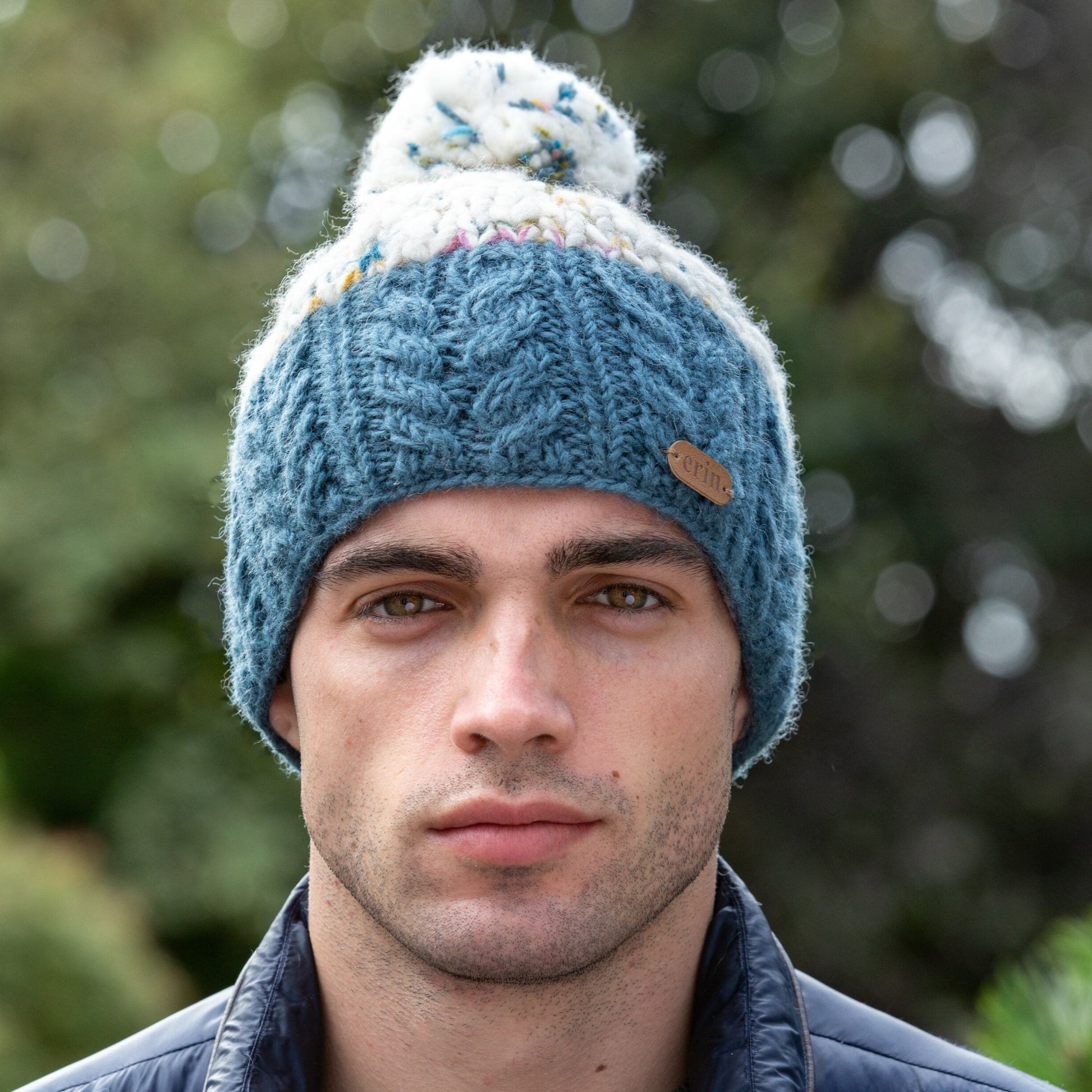 Luxury Thick Knitted Bobble Hat in Denim 100% Wool with Polyester fleece lining for extra warmth and comfort.