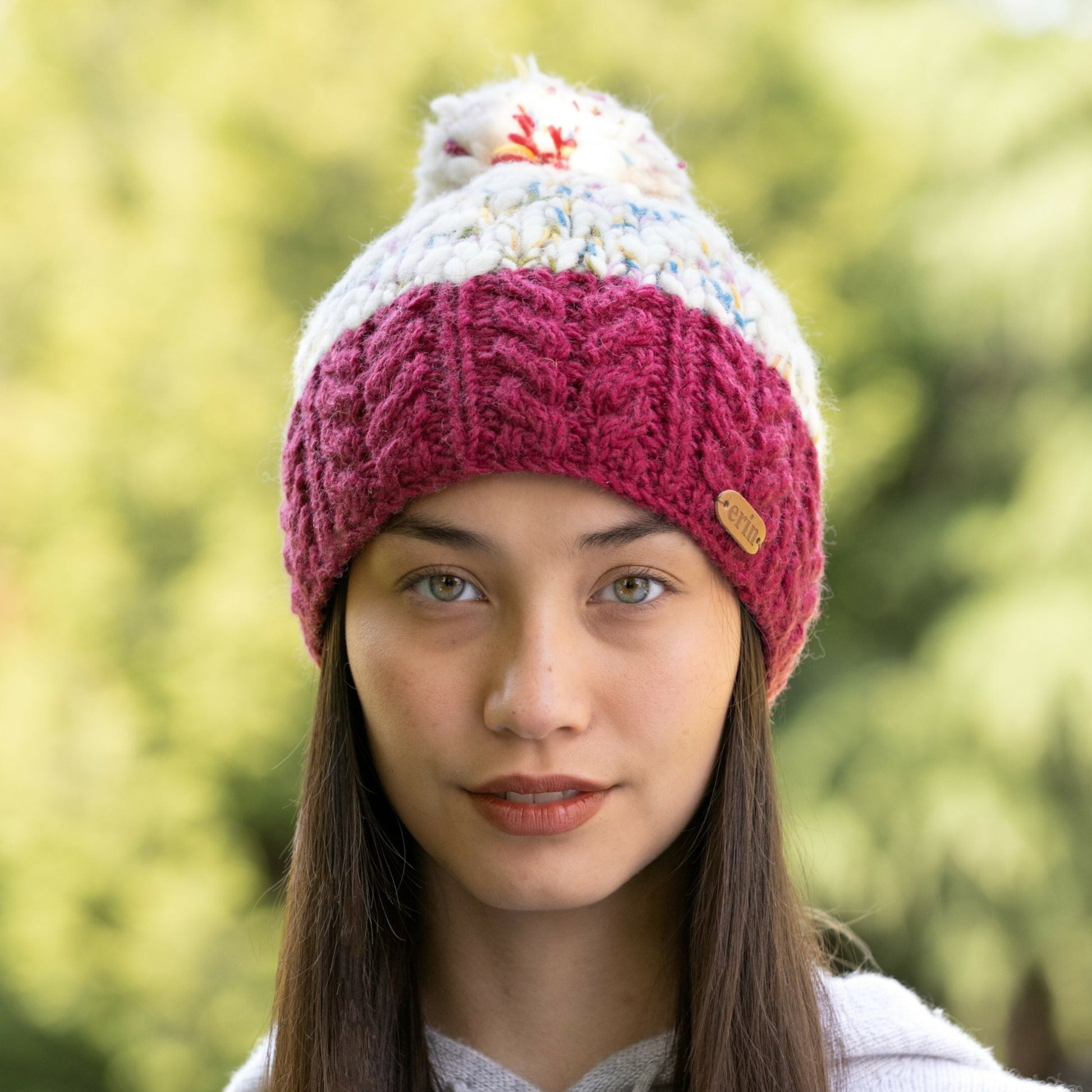 Luxury Thick Knitted Bobble Hat with flecked yarn and a Burnt Red coloured Aran Cable Knit Band. 100% Wool with Polyester fleece lining for extra warmth and comfort.