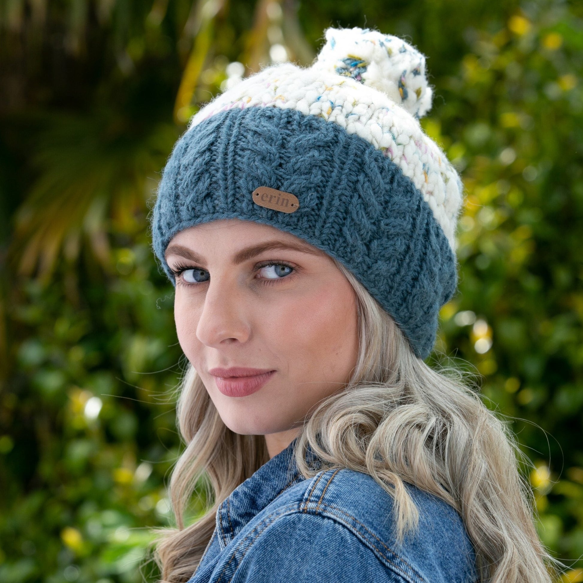 Luxury Thick Knitted Bobble Hat with flecked yarn and a Denim coloured Aran Cable Knit Band. 100% Wool with Polyester fleece lining for extra warmth and comfort.
