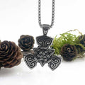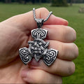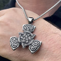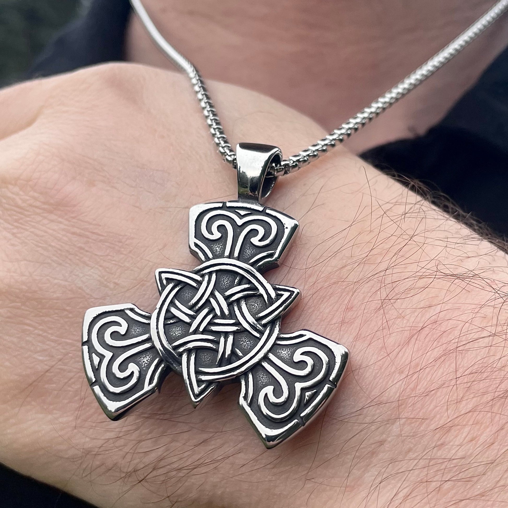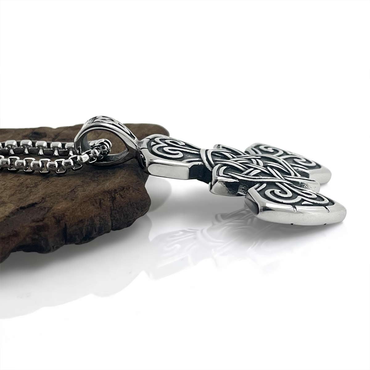 Crafted in Ireland from durable stainless steel, this Viking inspired pendant features intricate Viking engravings and a sleek, slender handle, but with Trinity Knotwork too to connect Irelands Viking past.