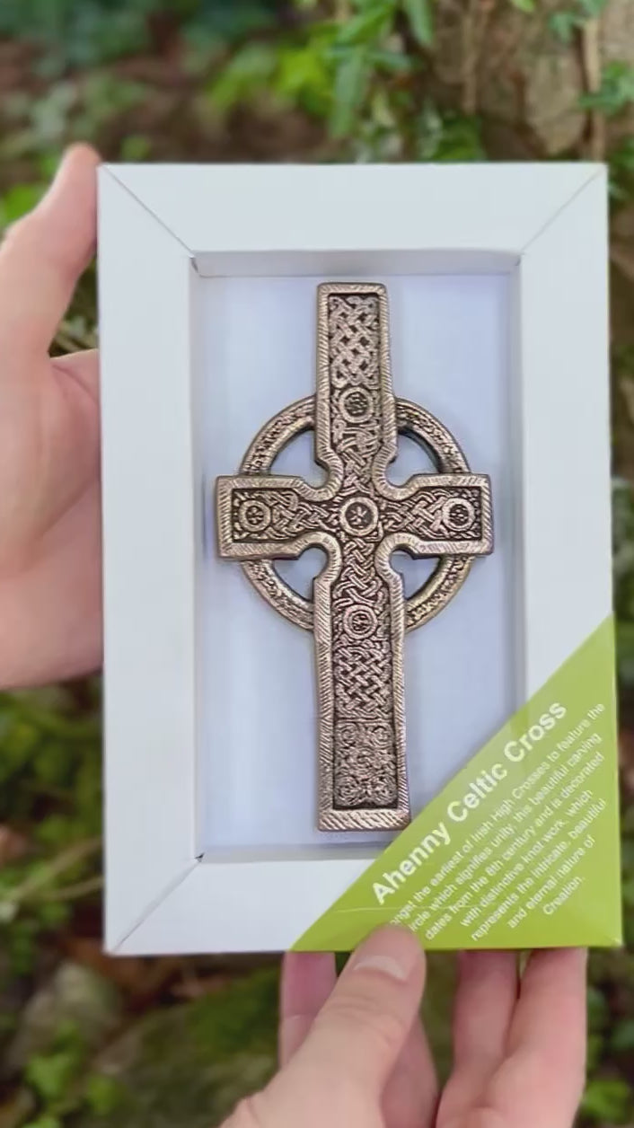 Ahenny Celtic Cross Amongst the earliest of Irish High Crosses to feature the circle which has come to signify unity, this beautiful carving dates from the 8th century and is decorated with distinctive knot work, which represents the intricate, beautiful and eternal nature of Creation. From a design by Adam Grabski, hand finished in pure bronze, this beautiful gift comes in a presentation box, measuring 9 x 6 inches (22 x 15cm).