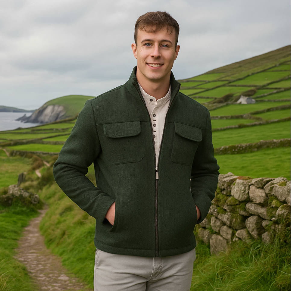 Handmade in Ireland, the Skellig features the traditional herringbone pattern in Olive, which gives the jacket a traditional and distinctive appearance.