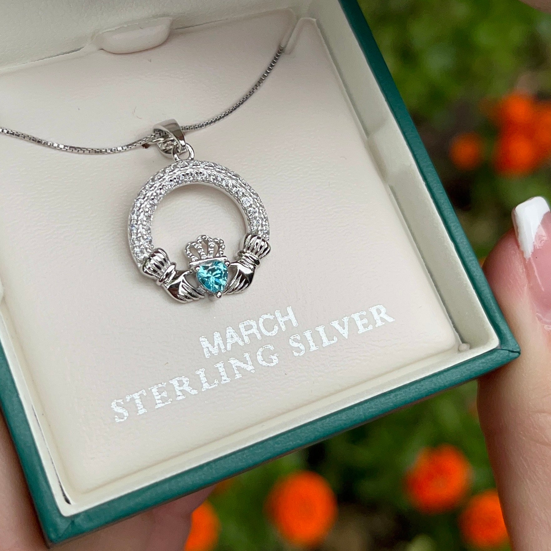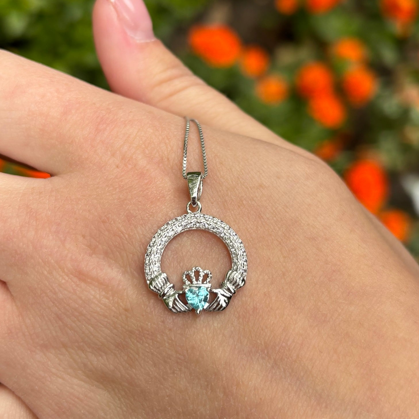 March Birthstone Aquamarine Silver Claddagh Pendant