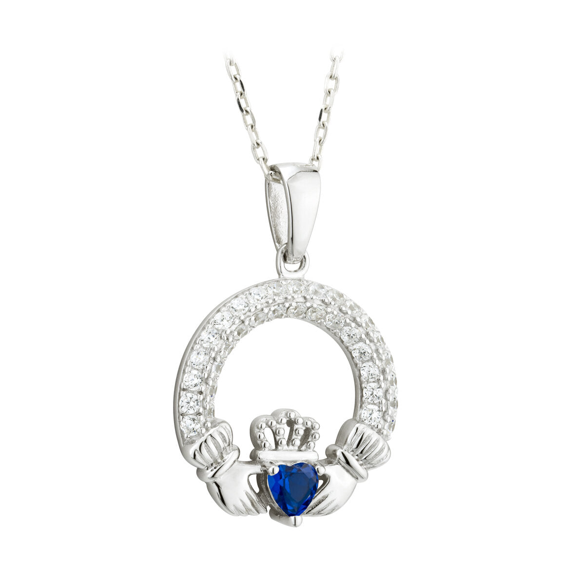 - Embrace the captivating beauty of September birthdays with our Sapphire Birthstone Pendant, featuring a mesmerizing deep blue sapphire set within the timeless Claddagh motif.