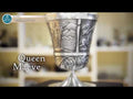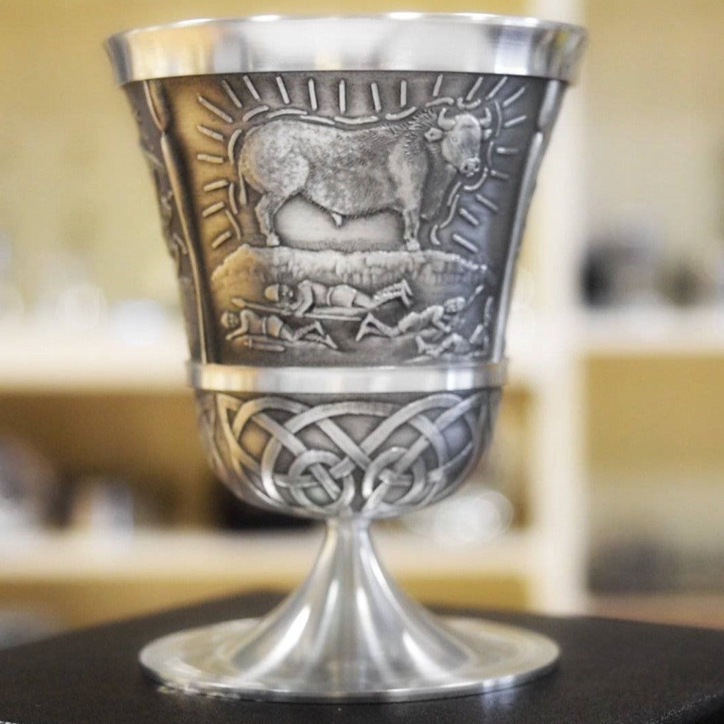 This elaborately handcrafted beaker features embossed scenes of the legendary Queen Maeve (Medb in the Old Irish spelling), the warrior queen of Connacht from the Iron Age who is shrouded in myth, with folklorists suggesting that she may have been a sovereignty goddess.